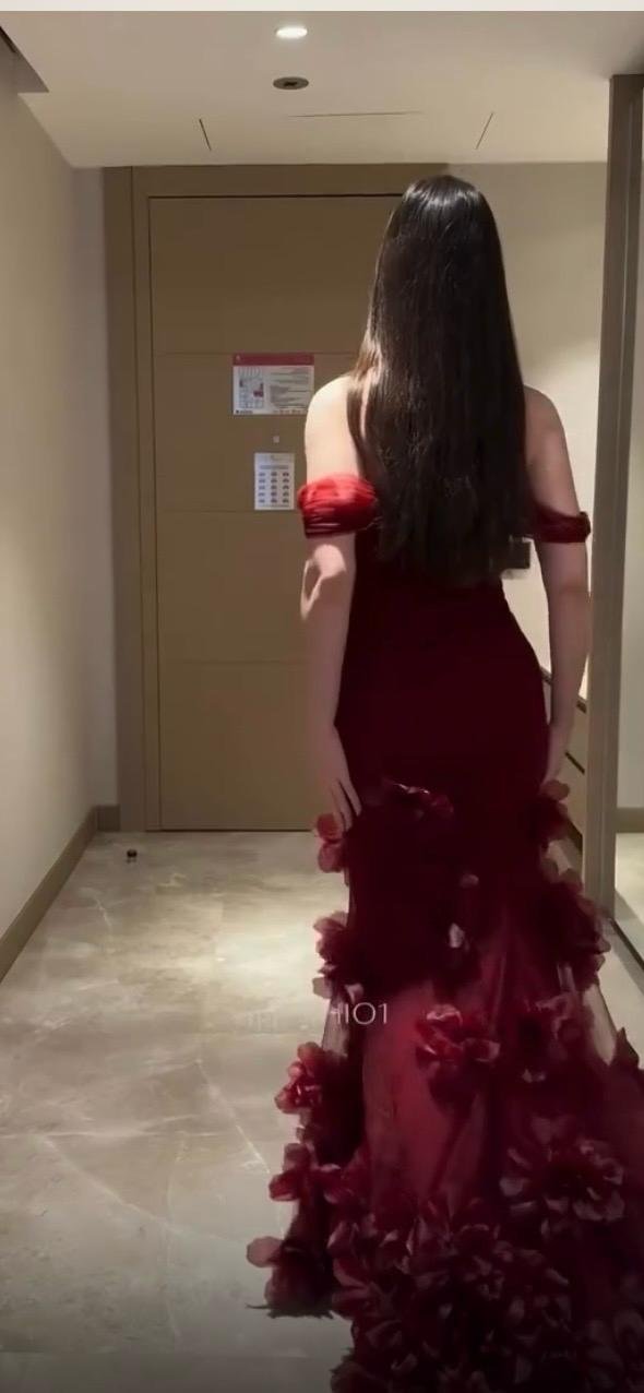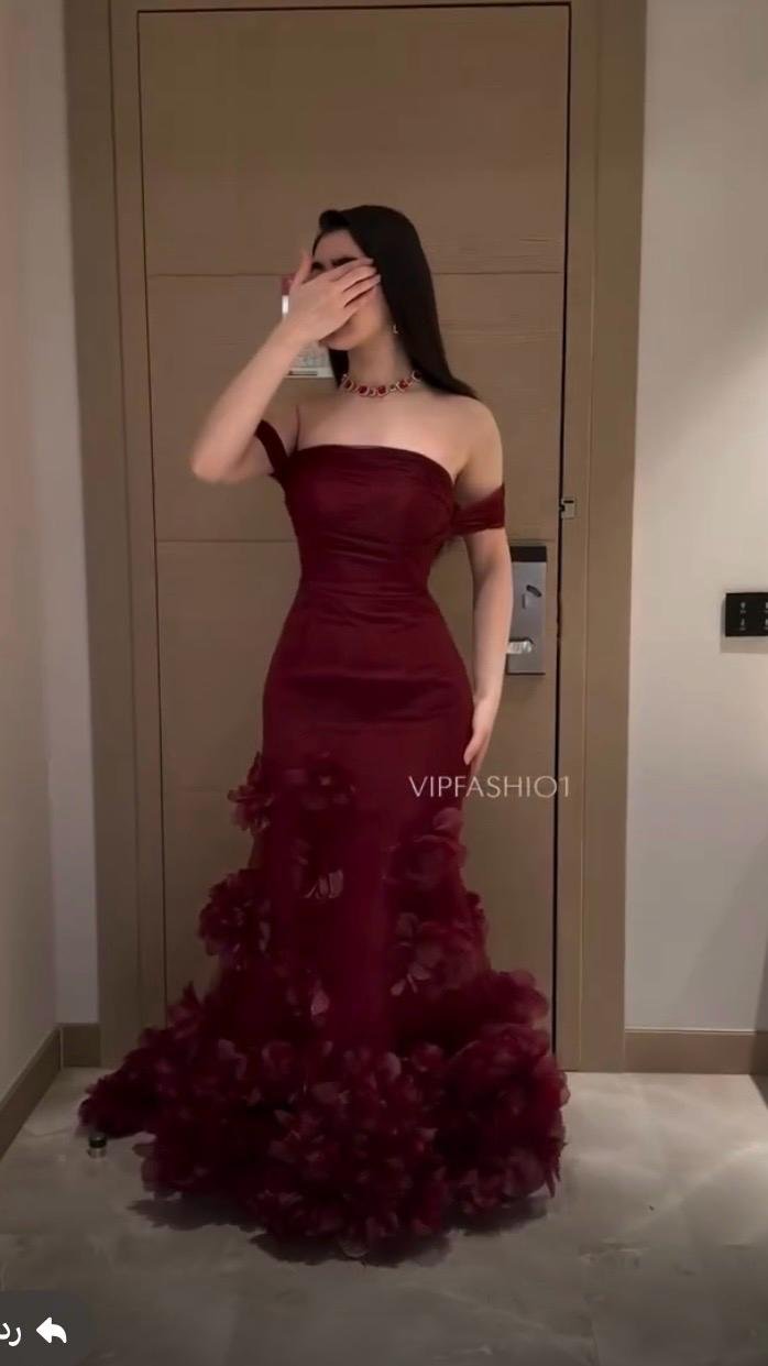 فستان مكشوف الأكتاف مع تفاصيل رائعة من الأزهار المصنوعة من القماش في أسفل الفستان وحول الخصر.