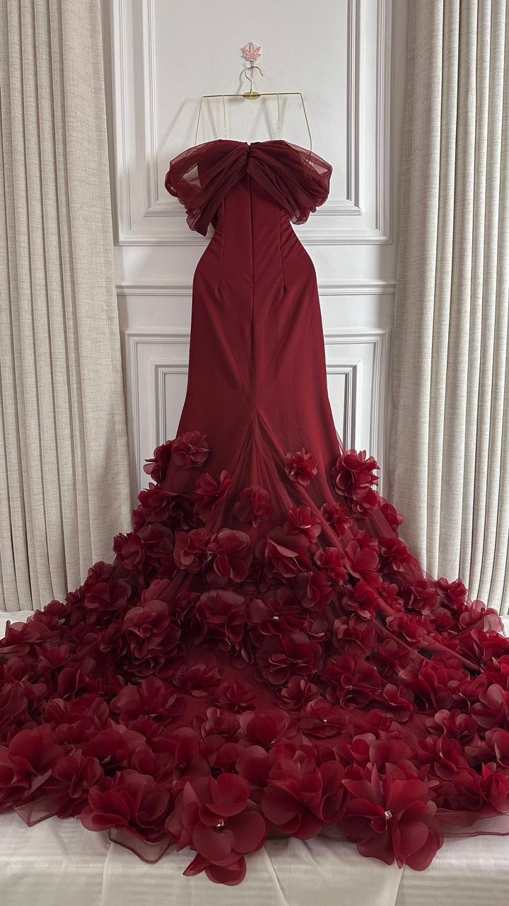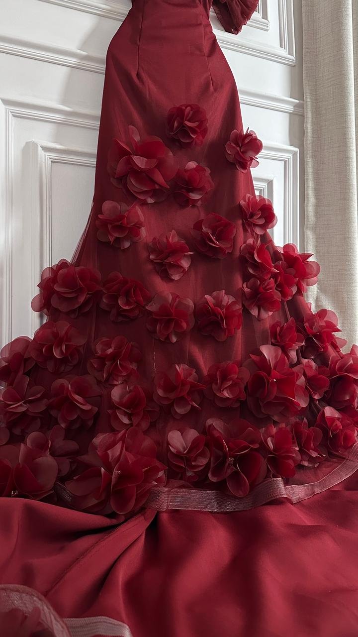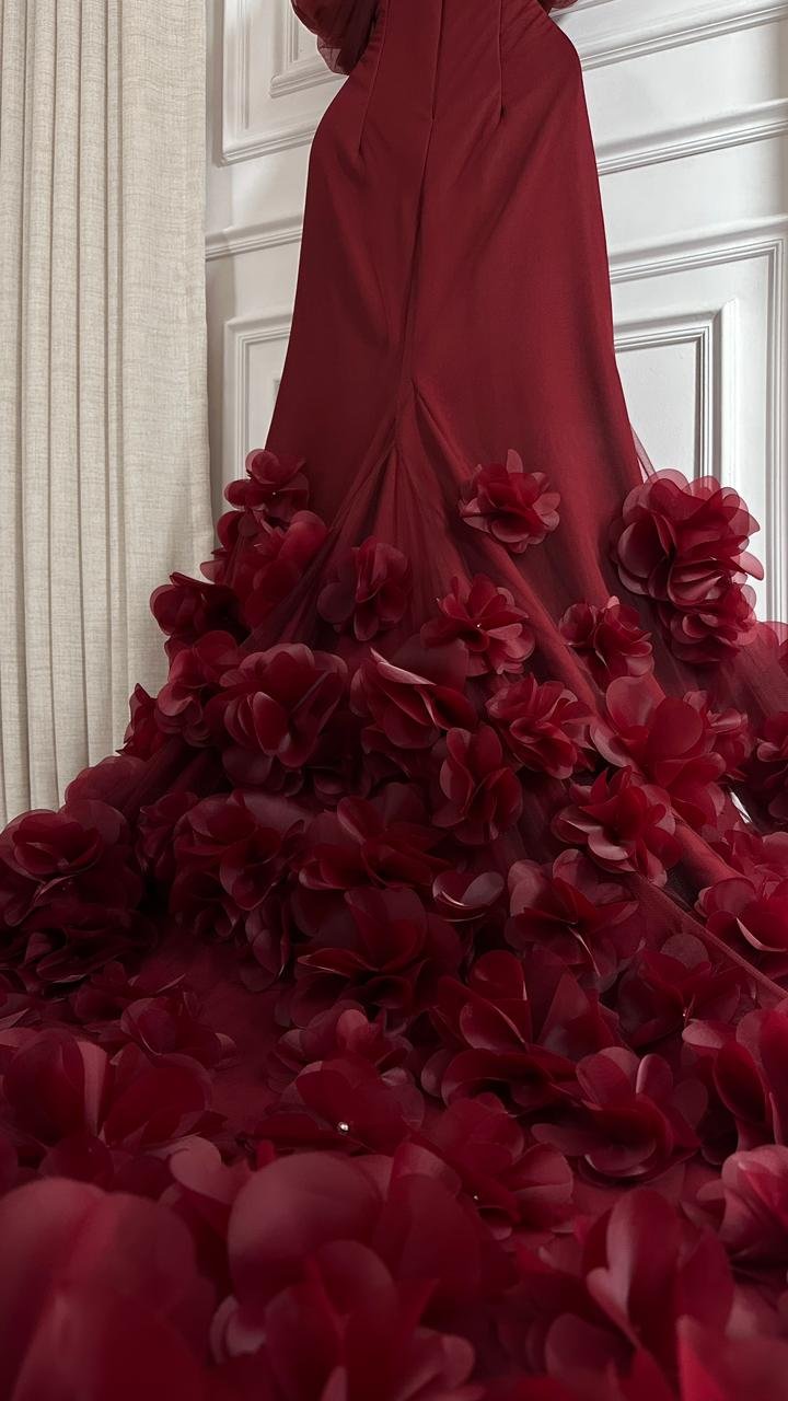 ذيل طويل ومتدفق مزين بالورود: ينتهي الفستان بـ ذيل طويل ومتدفق يجر على الأرض، ومزين أيضًا بكثافة بنفس الورود المقطوعة ليزر، مما يضمن لكِ حضورًا مسرحيًا لا يُنسى مع كل خطوة.