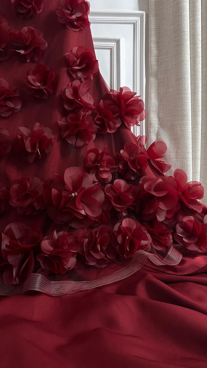 تطريز بارز من ورود قص ليزر ثلاثية الأبعاد: التنورة الطويلة هي تحفة فنية بحد ذاتها، مزينة بكثافة بتطريز بارز من ورود ثلاثية الأبعاد مصنوعة من قص ليزر (Laser-cut process). هذه الورود الدقيقة تبدأ من منتصف الفخذ وتزداد كثافة وتداخلًا بشكل درامي حتى حافة الفستان، مما يخلق تدرجًا بصريًا ساحرًا ومظهرًا مستوحى من الطبيعة.
