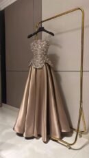 خامة الشبك المرصعة: الفستان مغطى بطبقة من الشبك الناعم المرصع بكثافة بـ فصوص الزركون اللامعة التي تتوزع بنمط هندسي وانسيابي، مما يخلق بريقاً مذهلاً يشبه النجوم تحت إضاءة السهرات.
