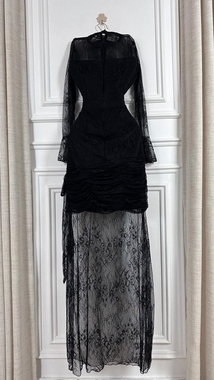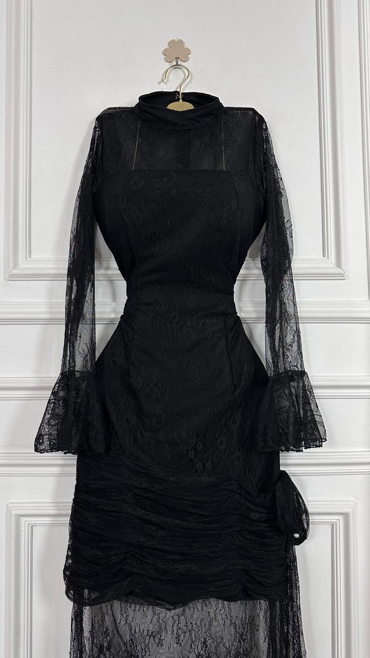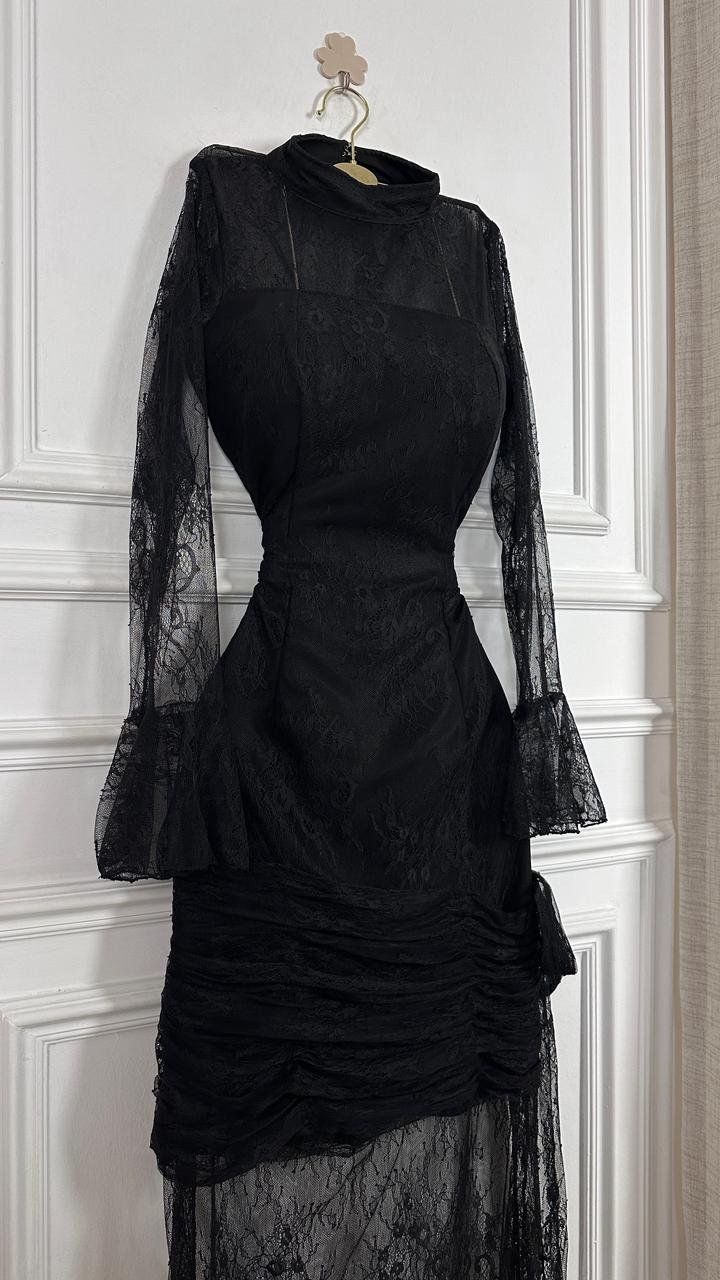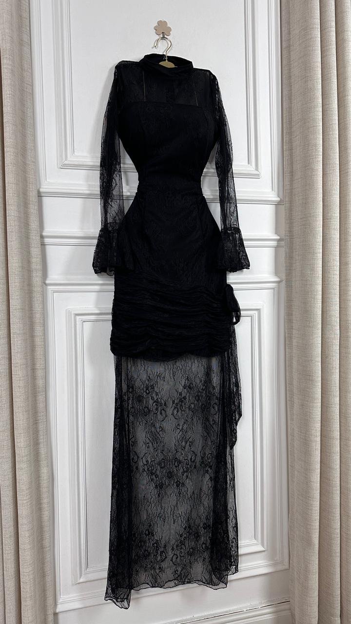 اعتمدي إطلالة تجمع بين الغموض الساحر والرقي الكلاسيكي مع هذا الفستان ، تصميم يبرز أنوثتكِ بتفاصيل الدانتيل الدقيقة وقصة تبرز جمال القوام بأسلوب عصري وأنيق.