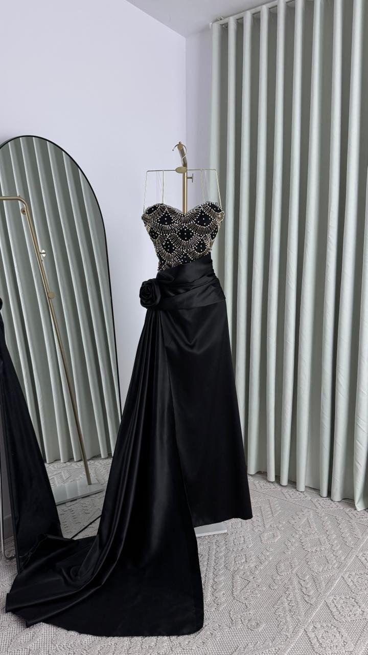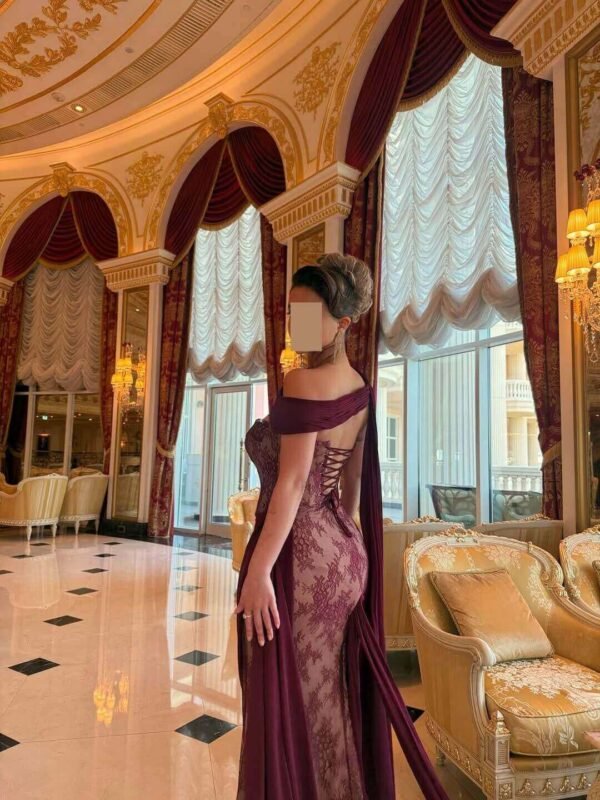 القصة الملكية مع ذيل منسدل: يتميز الفستان بقصة مستقيمة تتحول بذكاء إلى ذيل جانبي طويل ومنسدل بأسلوب انسيابي، مما يمنحكِ مشية ملكية وحضوراً لا يُنسى.
