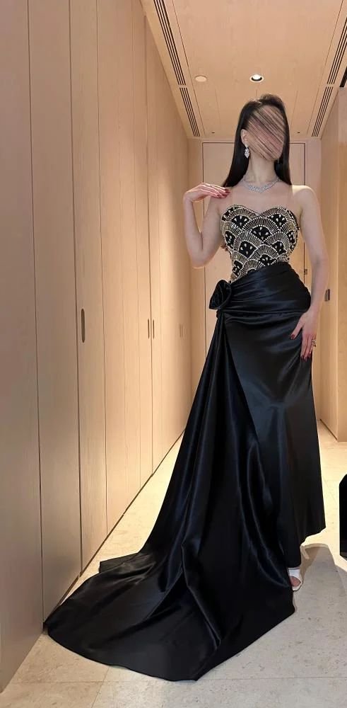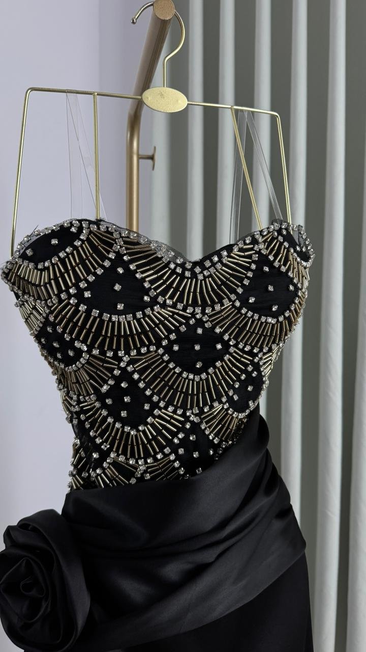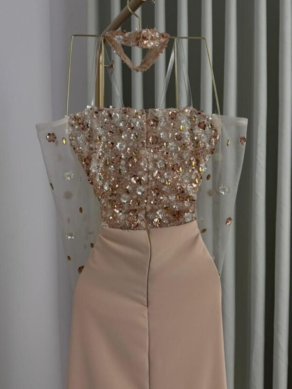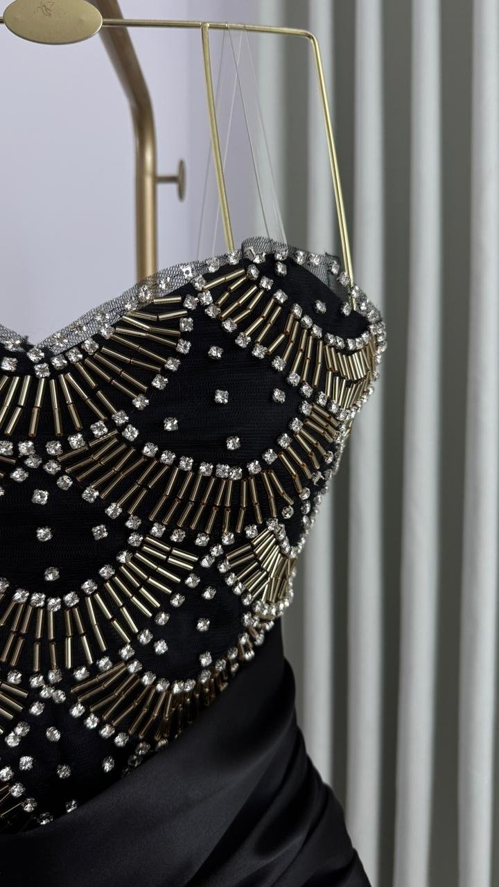 كورسيه (صدرية) مرصع بالكامل: يتميز الجزء العلوي بتصميم “توب” محدد للجسم، مشغول بـ تطريز يدوي فائق الدقة بخرز ذهبي وفصوص كريستالية على شكل أنماط مروحية ملكية، مما يمنحكِ بريقاً استثنائياً تحت الأضواء.