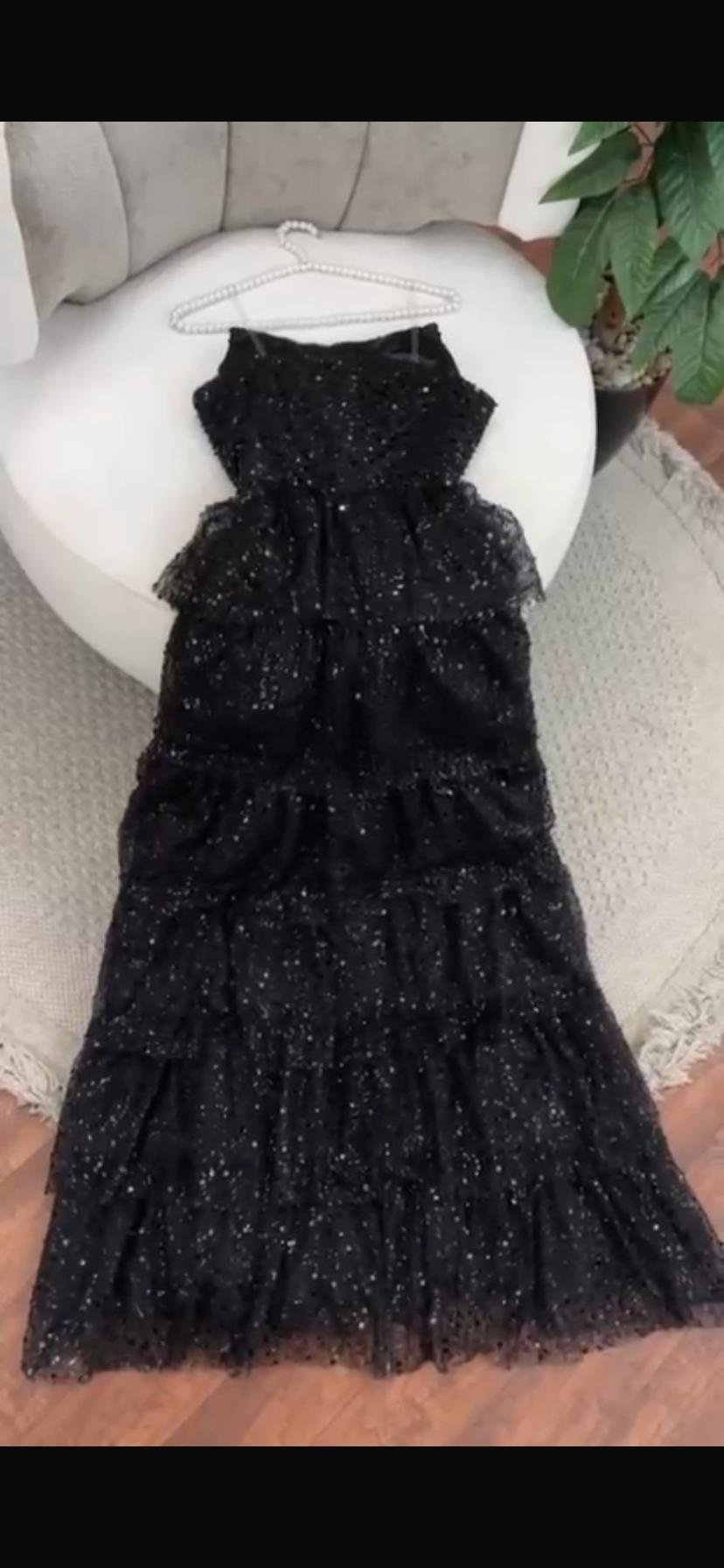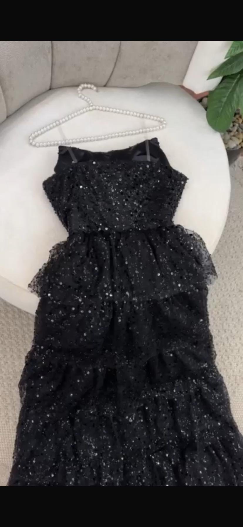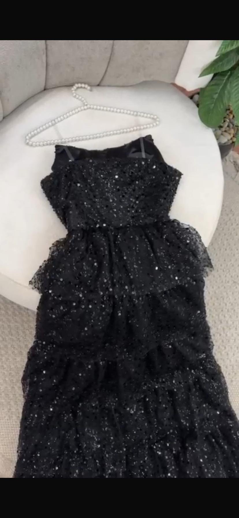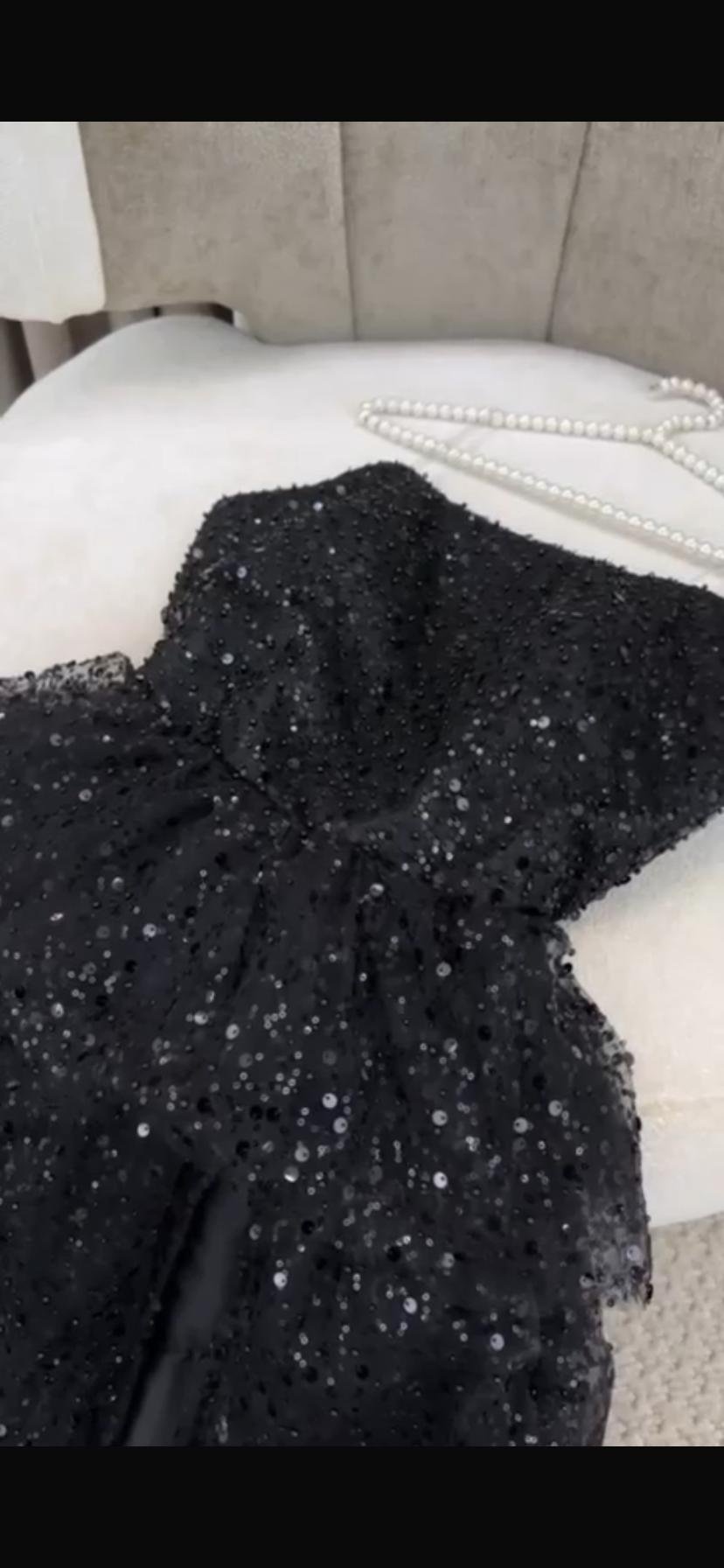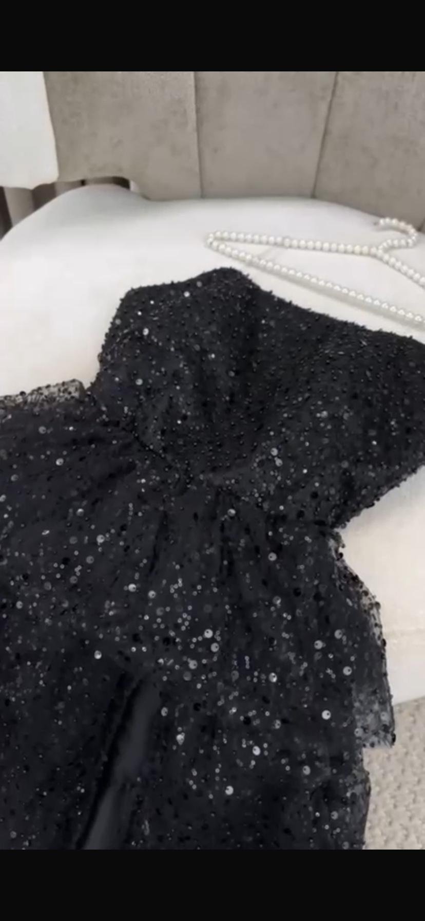 الخامة والنسيج: الفستان مصنوع من التل الناعم عالي الجودة، المزين بالكامل بتطريزات دقيقة من الخرز والترتر الأسود البراق، مما يمنحه لمعة ساحرة تحت الأضواء.