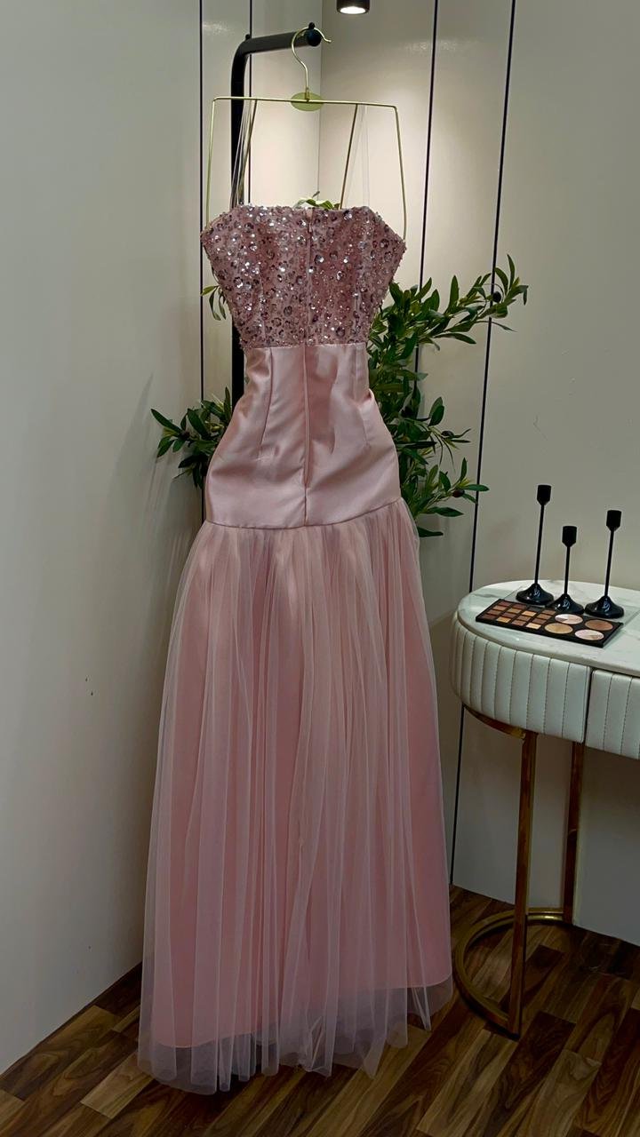 الصدر (التوب المطرز): يتميز الفستان بتصميم “توب” (بدون أكمام) مشغول بالكامل بكريستالات وأحجار لامعة بدرجات الوردي المتفاوتة، مما يمنح الصدر بريقاً لافتاً وتفاصيل غنية تفيض بالفخامة.