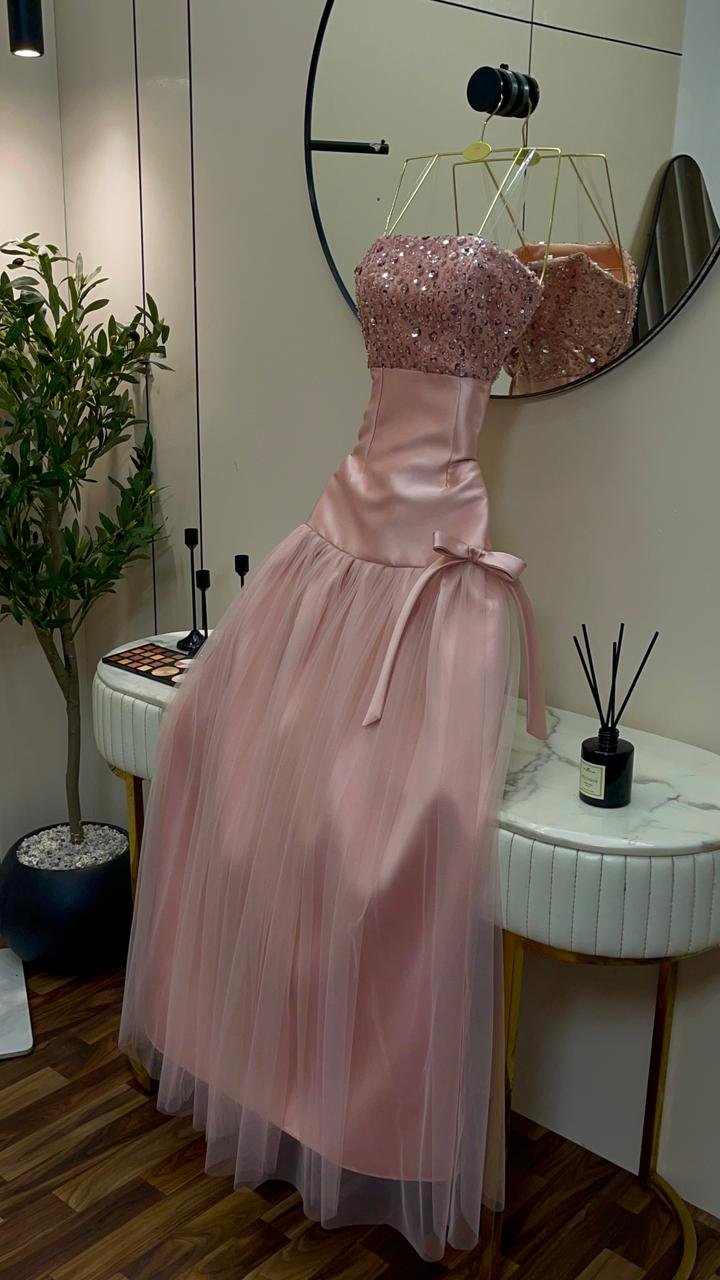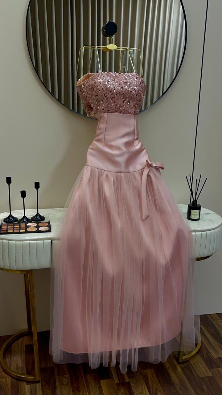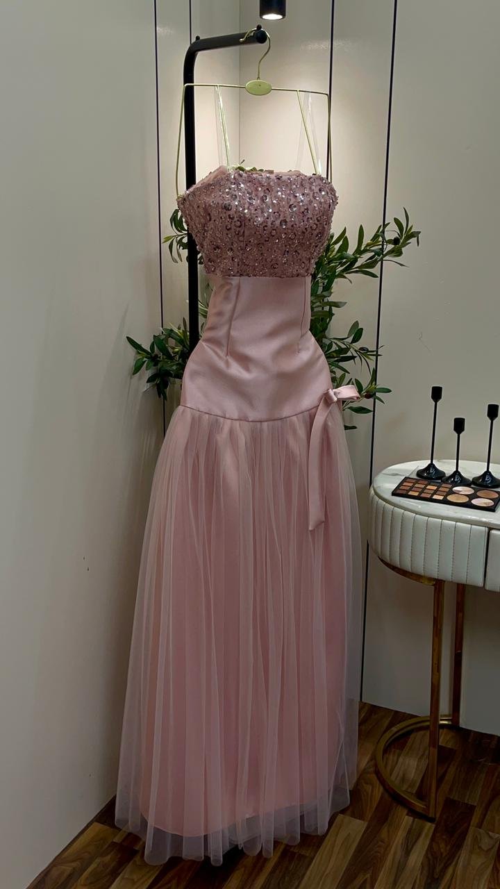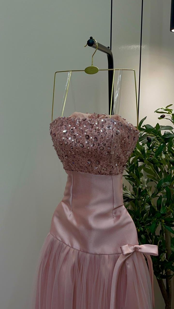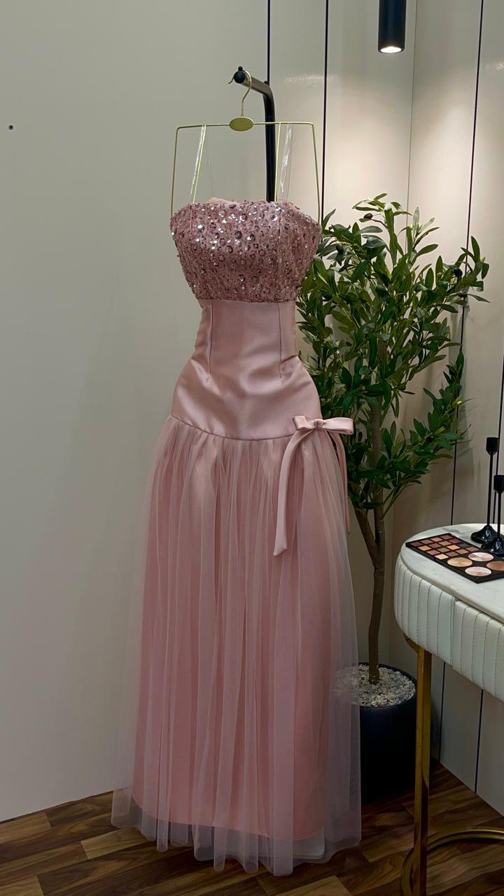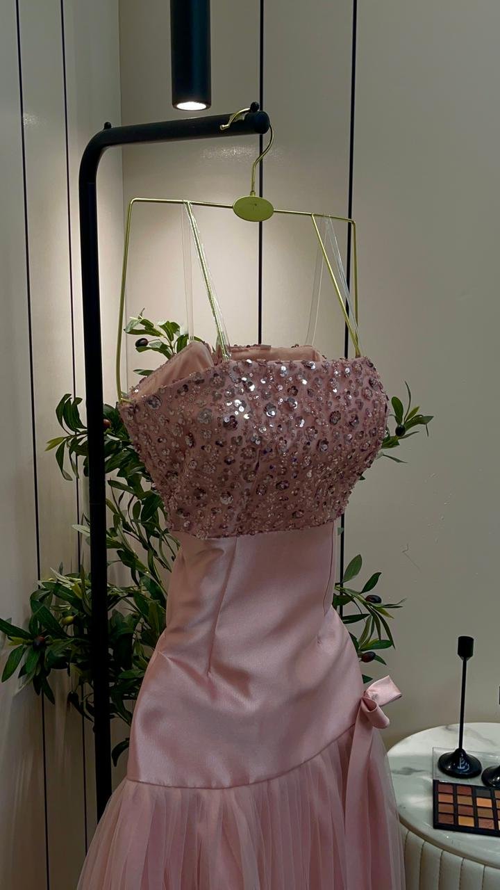 اللون الوردي الهادئ: يأتي الفستان بلون “بيبي بينك” (Baby Pink) ناعم، وهو اللون المثالي لإبراز النعومة والرقي في مناسبات الخطوبة والسهرات الخاصة.