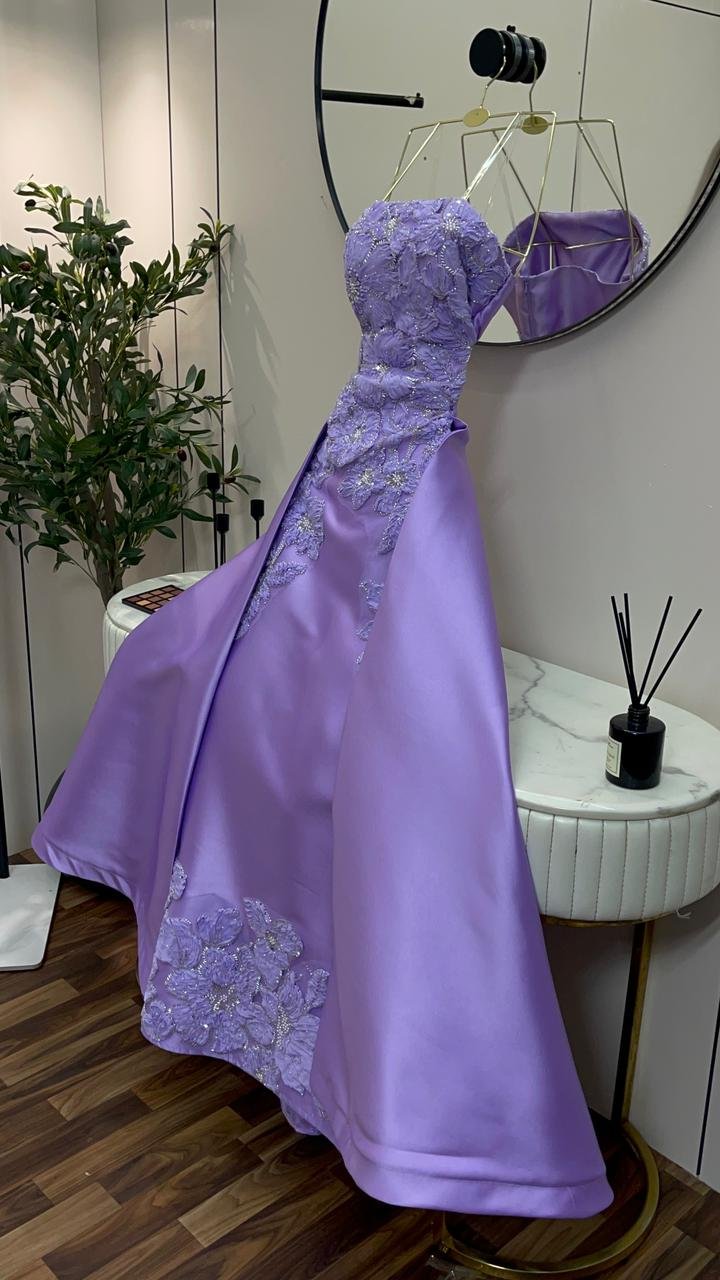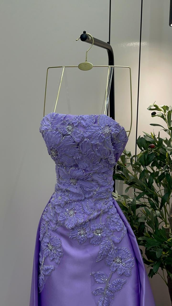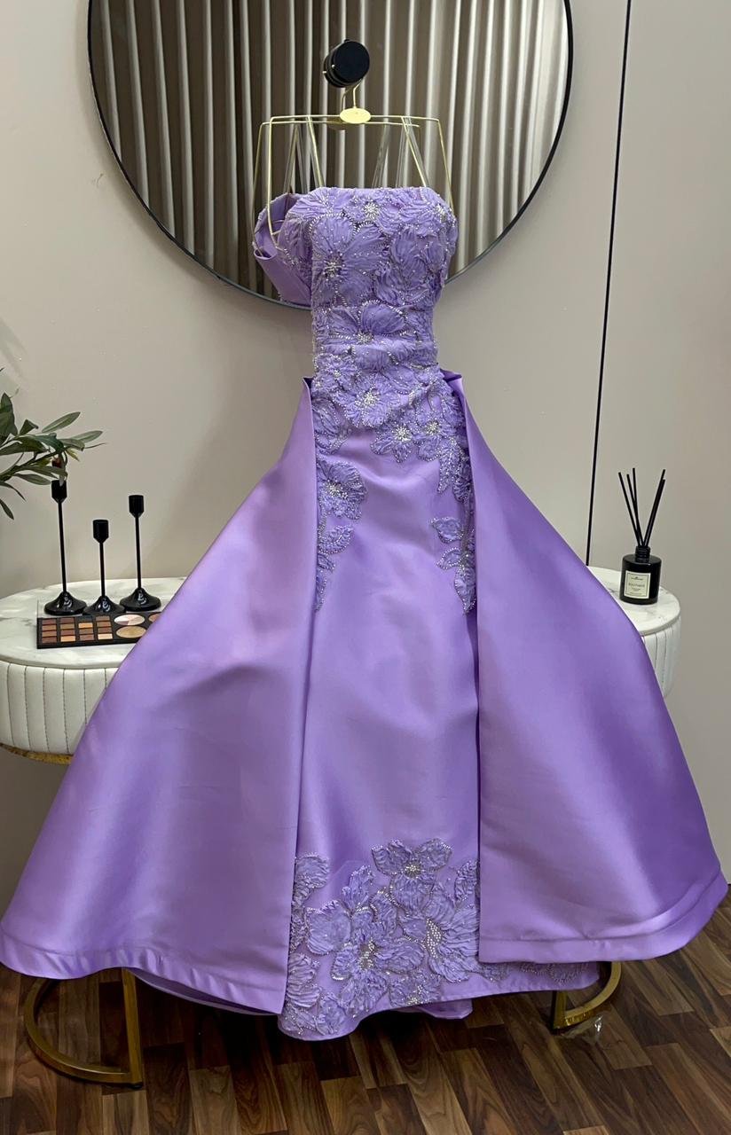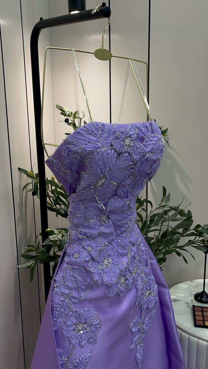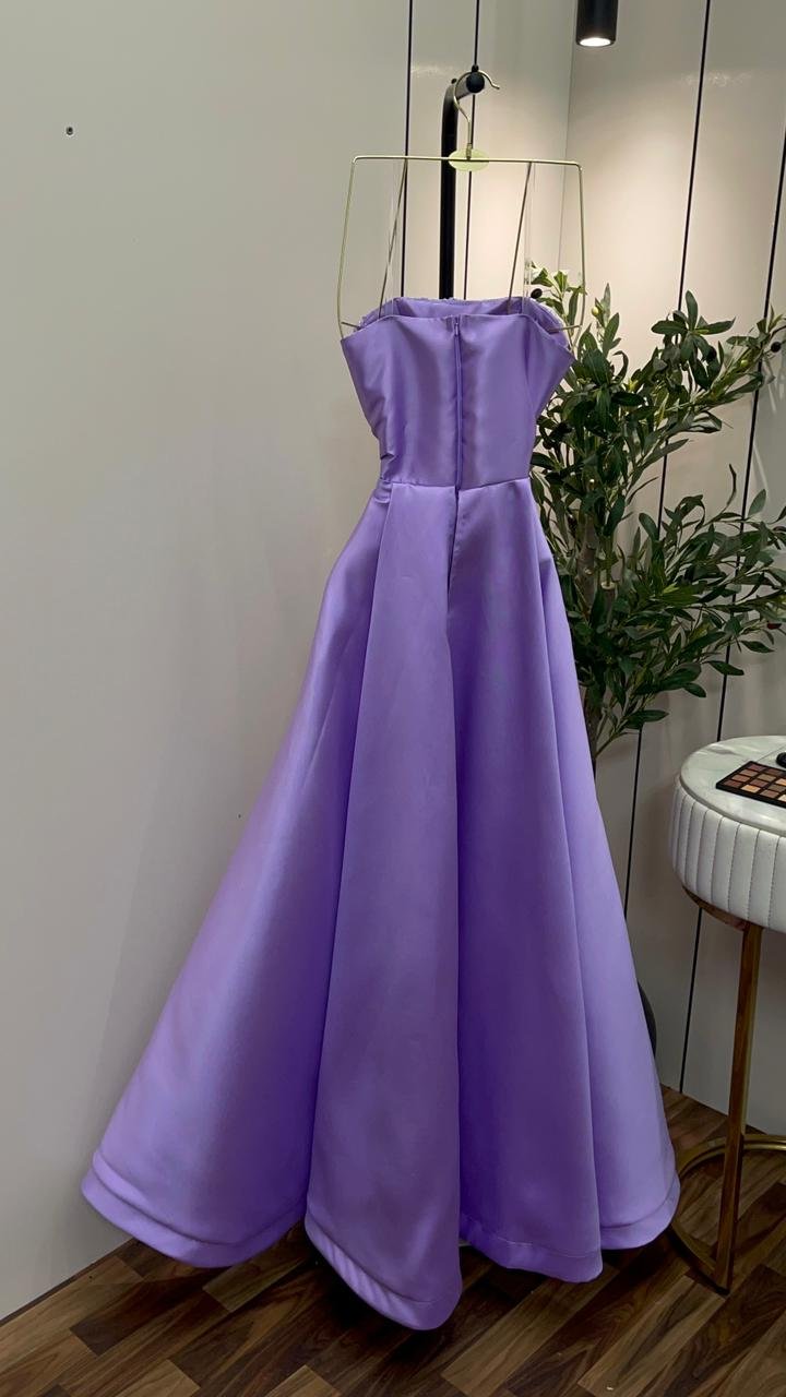 خامة الميكادو الفاخرة: الفستان مصنوع من قماش الميكادو (Mikado fabric) ذي الجودة العالية، المتميز بقوامه المتماسك ومظهره المصقول الذي يمنحه وقاراً ملكياً. هذا القماش الفاخر يضمن لكِ مظهراً هيكلياً محدداً يحافظ على شكله الأنيق طوال السهرة.