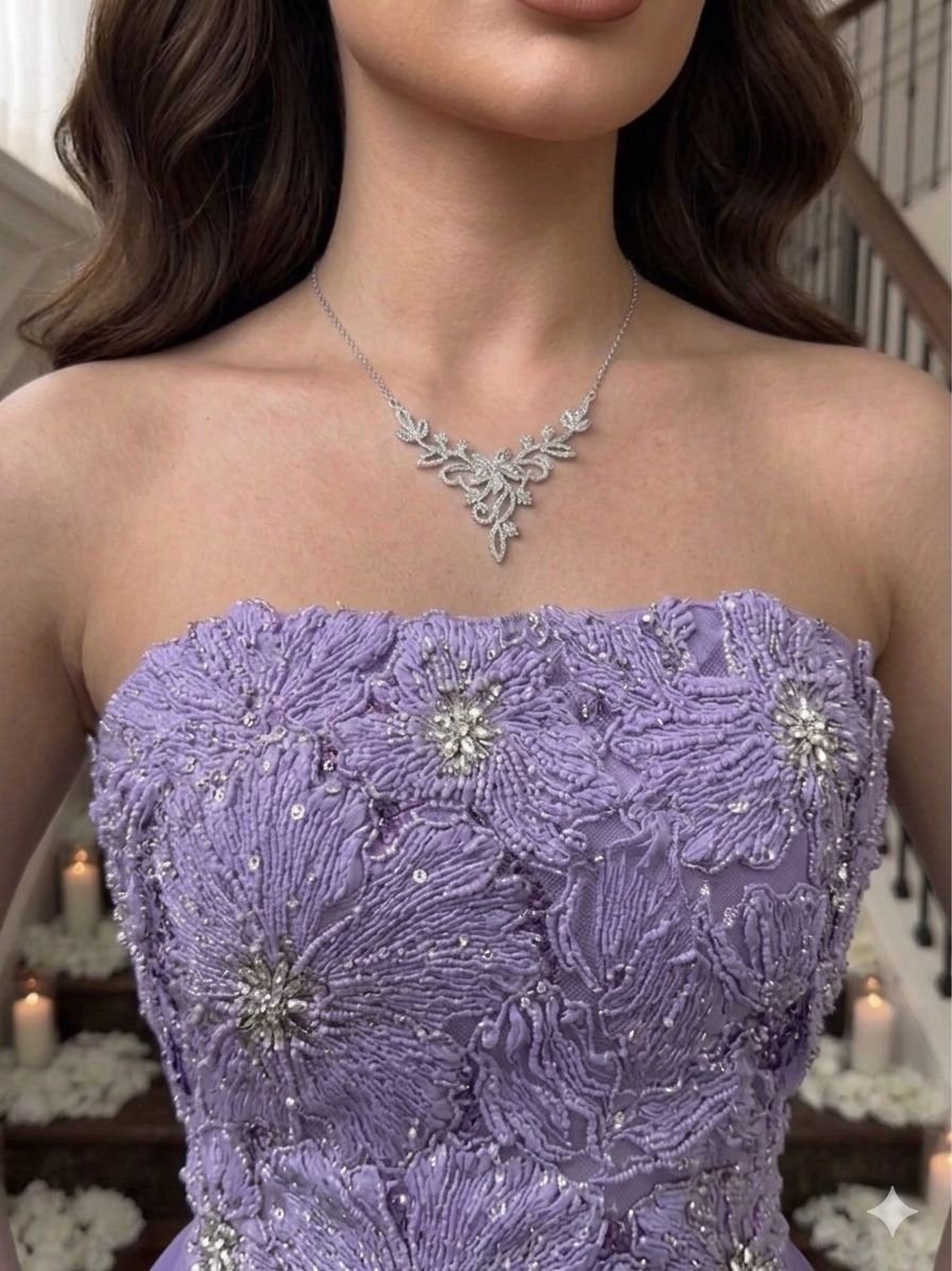 تصميم المشد (Corset Bodice) المرصع: الجزء العلوي مصمم بأسلوب مشد (Corset-style) محدد يبرز جمال القوام ويحدد الخصر بدقة. هذا المشد مرصع بكثافة بكلفة ورود ثلاثية الأبعاد (3D Floral Appliques) مع بريق كريستالي متلألئ، مما يمنحه مظهراً ملكياً فاخراً.
