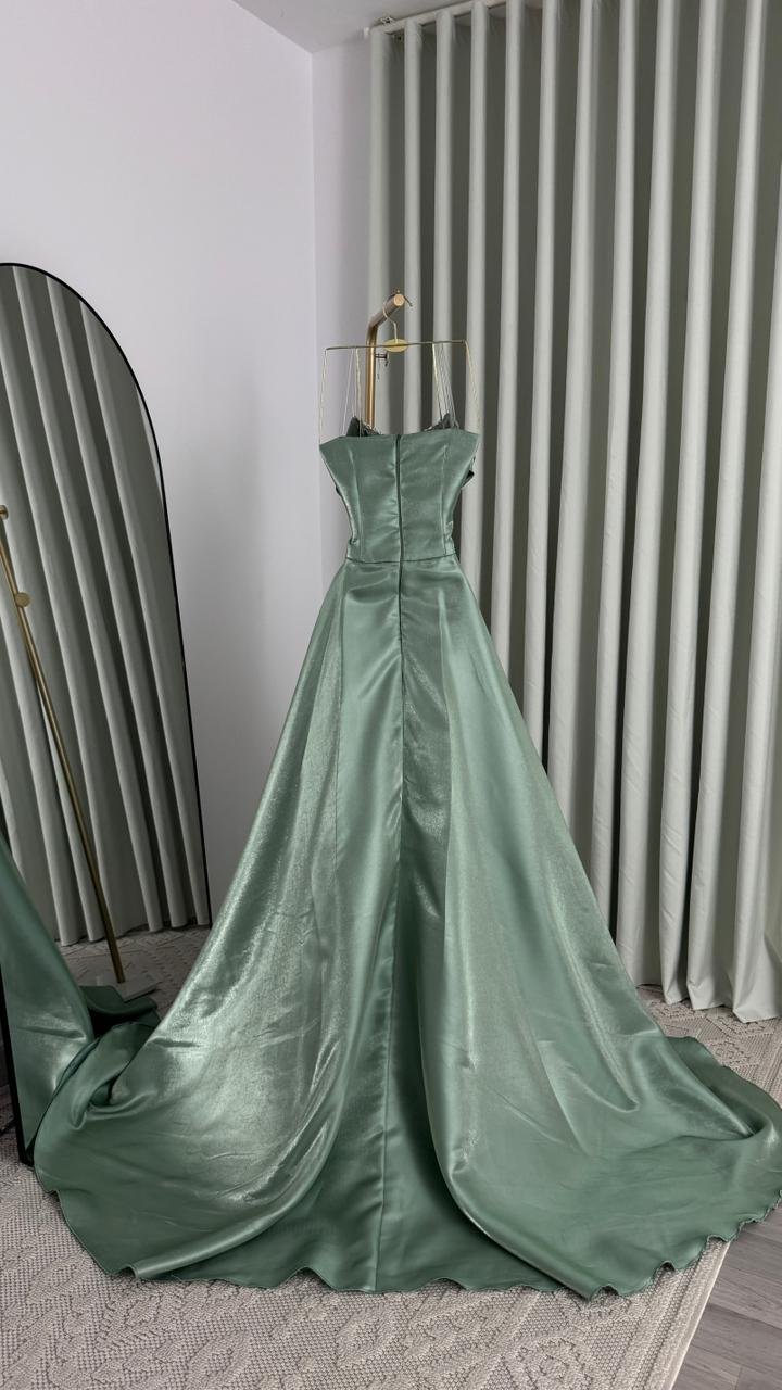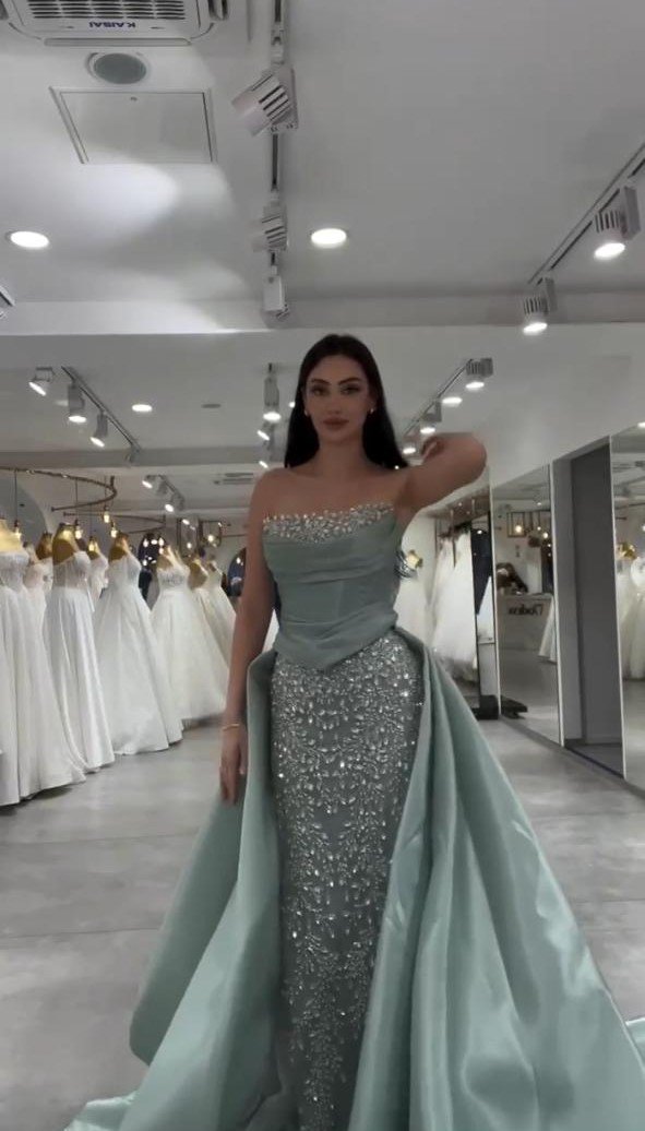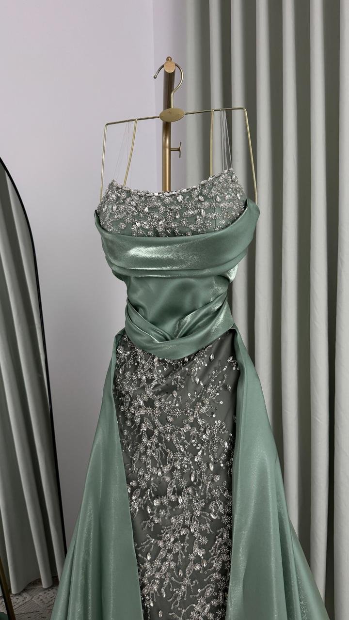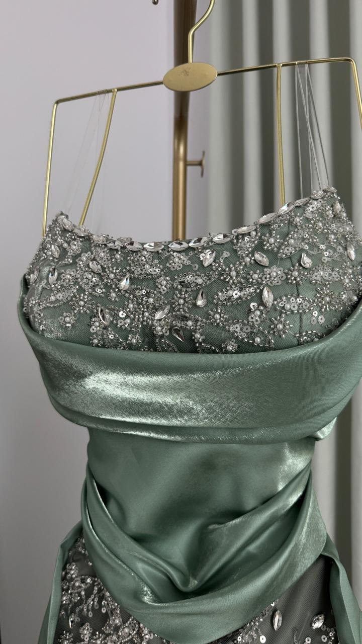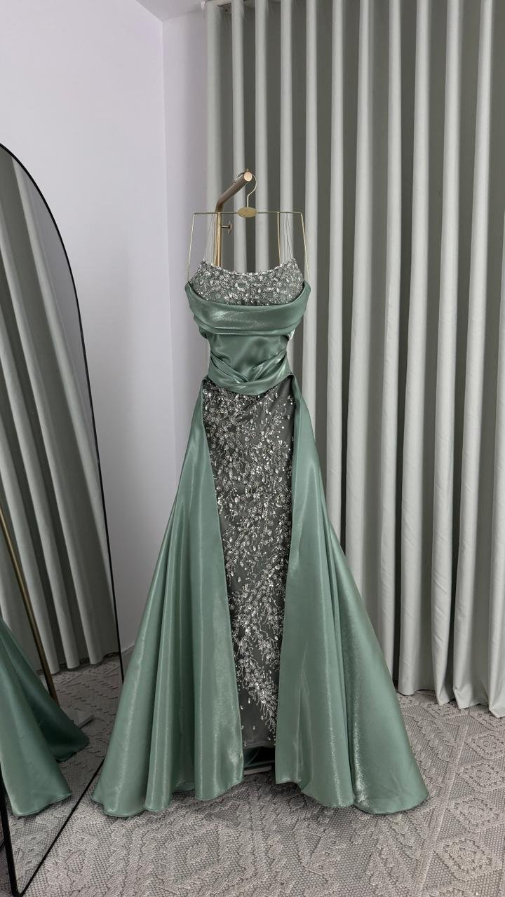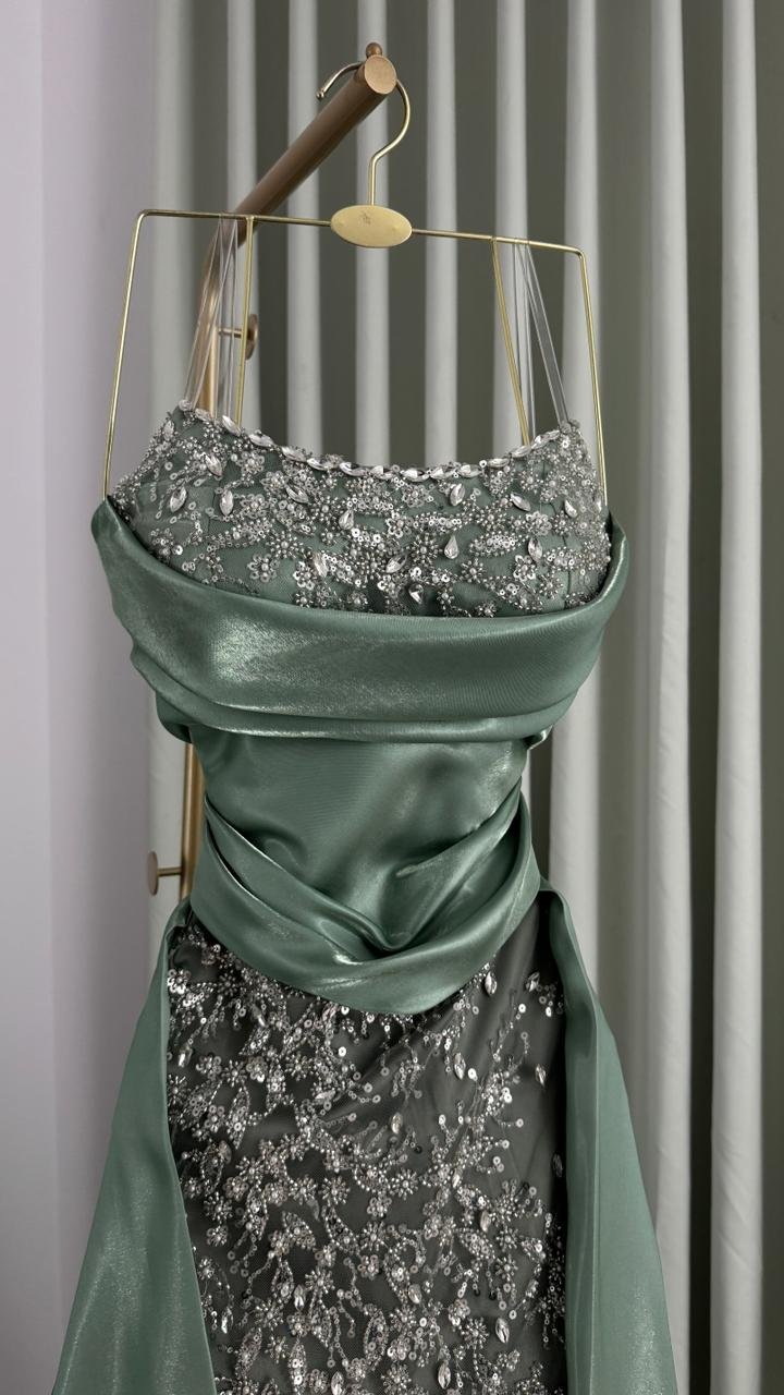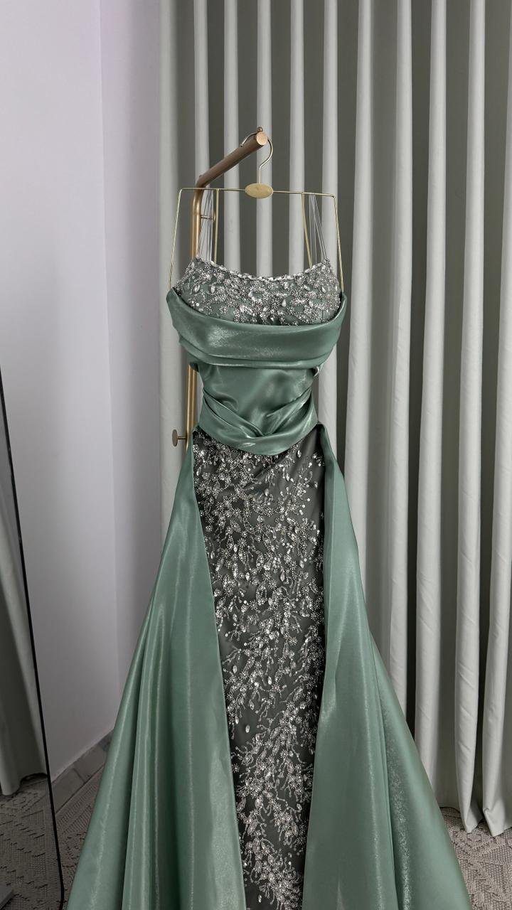 فستان سهرة فخم بلون أخضر زمردي فاتح (Sage Green) مصنوع من خامة الكرنكر اللامعة بتصميم يجمع بين الرقي والبريق. يتميز الفستان بصدر مزموم يبرز القوام، مزين بالكامل بتطريز غني من الخرز والكريستال اللامع الذي يمتد بانسيابية على التنورة المستقيمة، مما يمنحه مظهراً يفيض بالأنوثة والفخامة. تضفي خامة الكرنكر اللامعة ملمساً فريداً وحركة انسيابية على الفستان، مما يجعله مثالياً للمناسبات والسهرات الخاصة، مع تنورة كلوش واسعة من الخلف، ومزوداً بسحاب خلفي مخفي لضمان سهولة الارتداء والخلع.