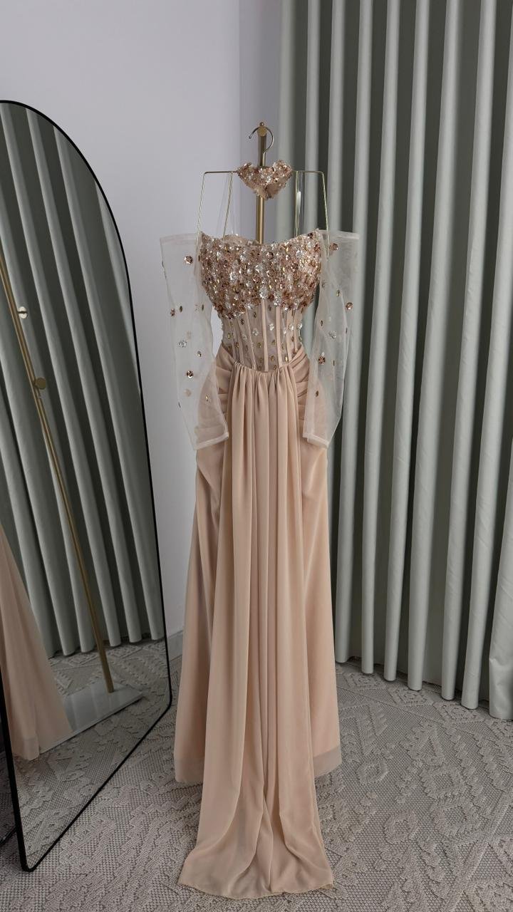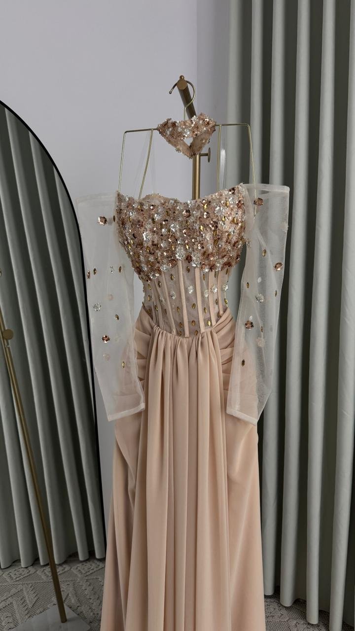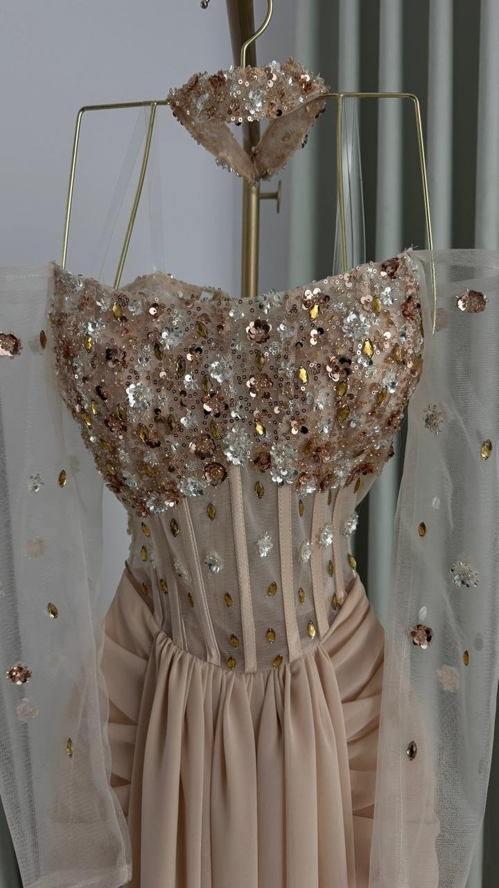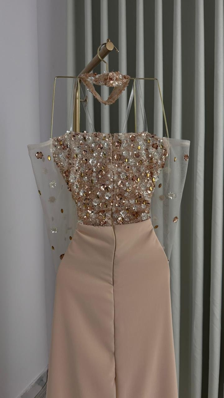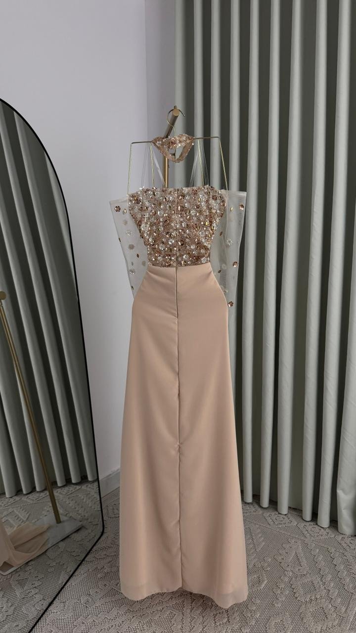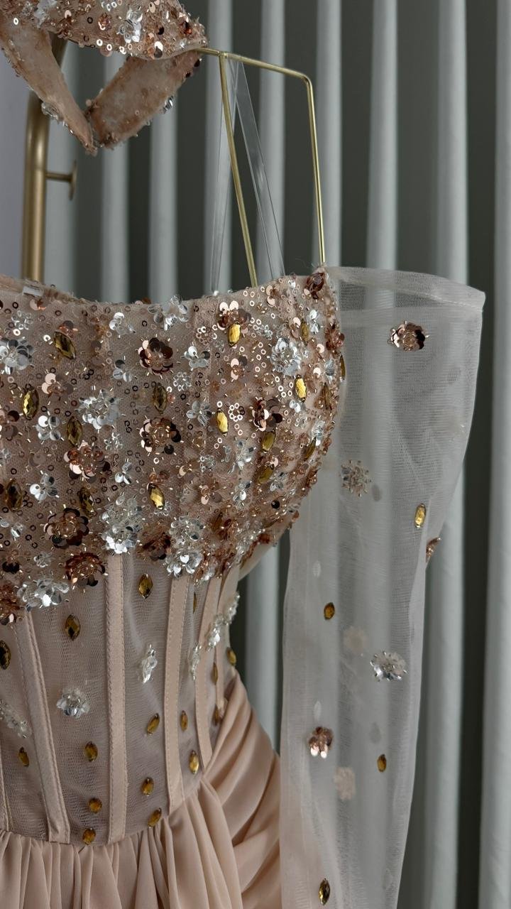 فستان سهرة “بيج” من الشيفون والمرصع بالخرز