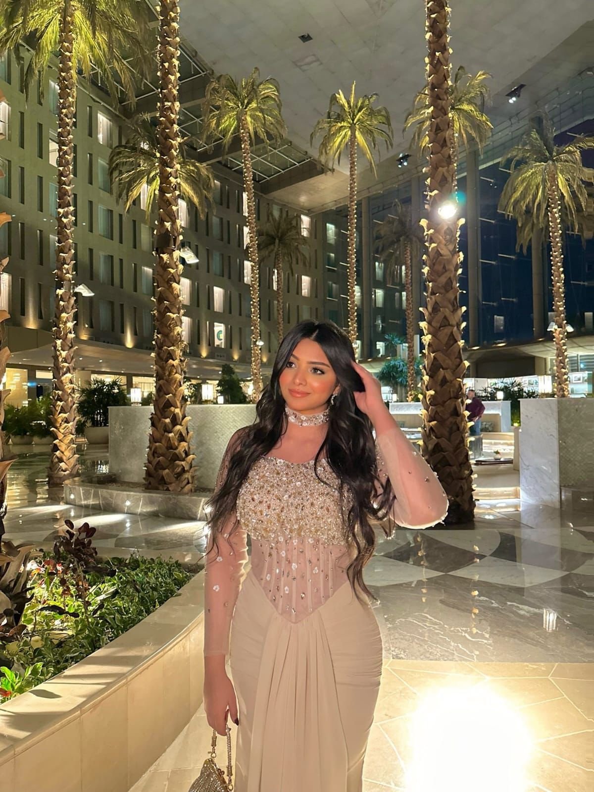 العنق: يتميز الفستان بياقة عالية على شكل “جولتر” (Choker)، مصنوعة من التل الشفاف ومزينة بـ حبيبات الخرز، مما يضيف لمسة من الأناقة والتألق.