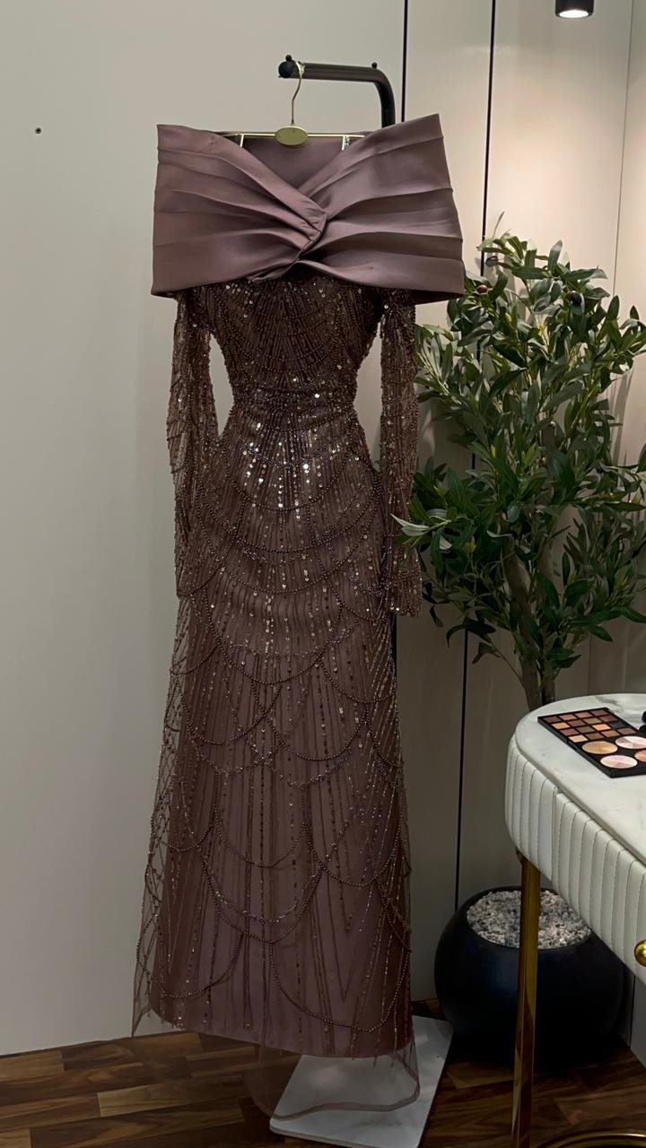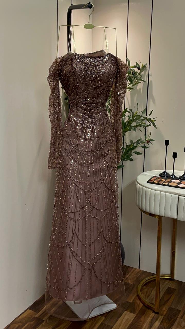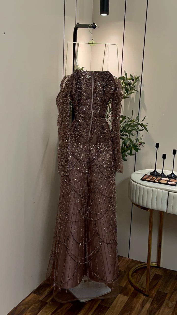 اللون البرونزي الملكي: يأتي الفستان بلون برونزي دافئ (Rose Bronze) يتناغم بشكل مثالي مع مختلف ألوان البشرة ويزيده التطريز الكثيف فخامة وعمقاً.