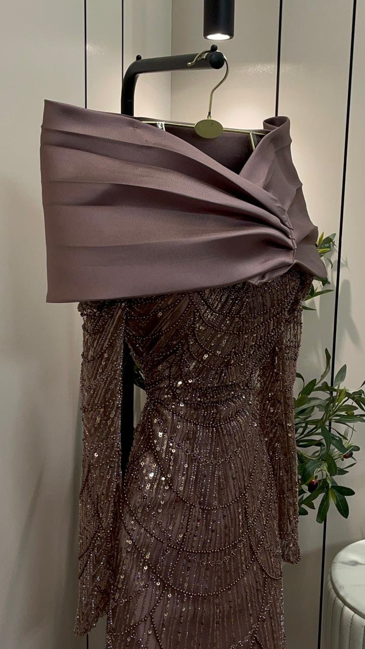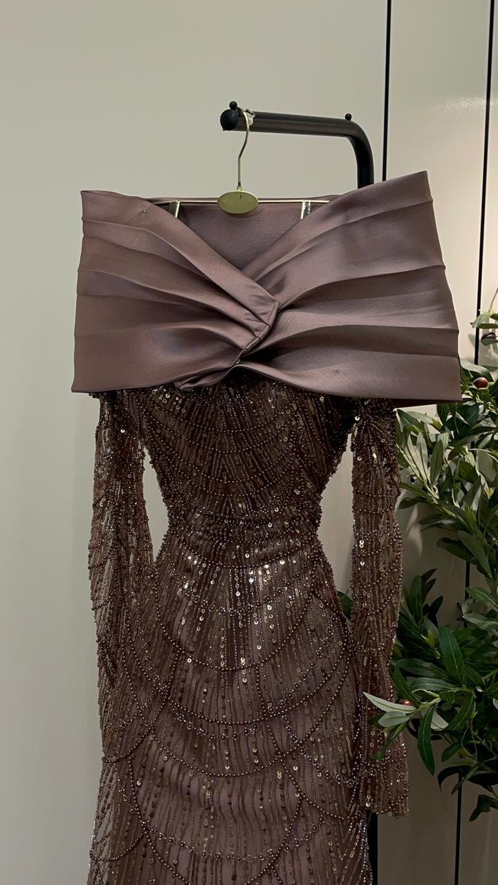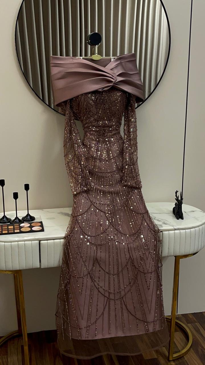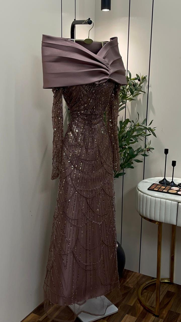 اللون البرونزي الملكي: يأتي الفستان بلون برونزي دافئ (Rose Bronze) يتناغم بشكل مثالي مع مختلف ألوان البشرة ويزيده التطريز الكثيف فخامة وعمقاً.