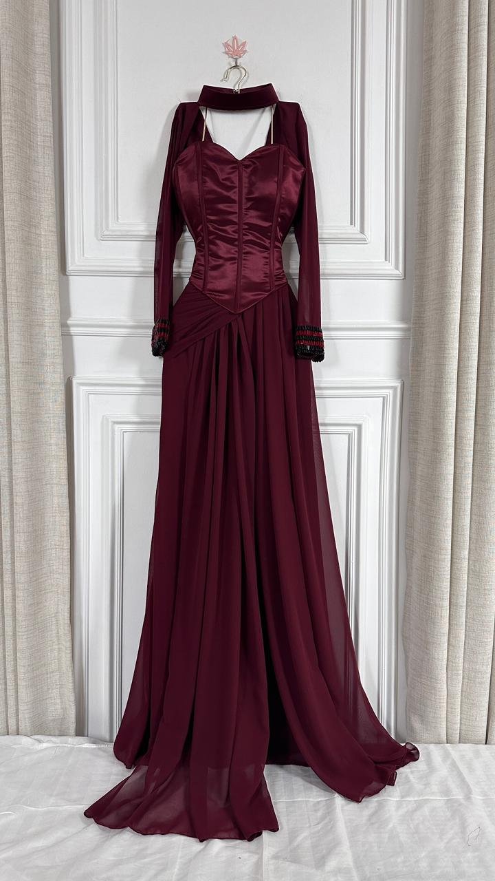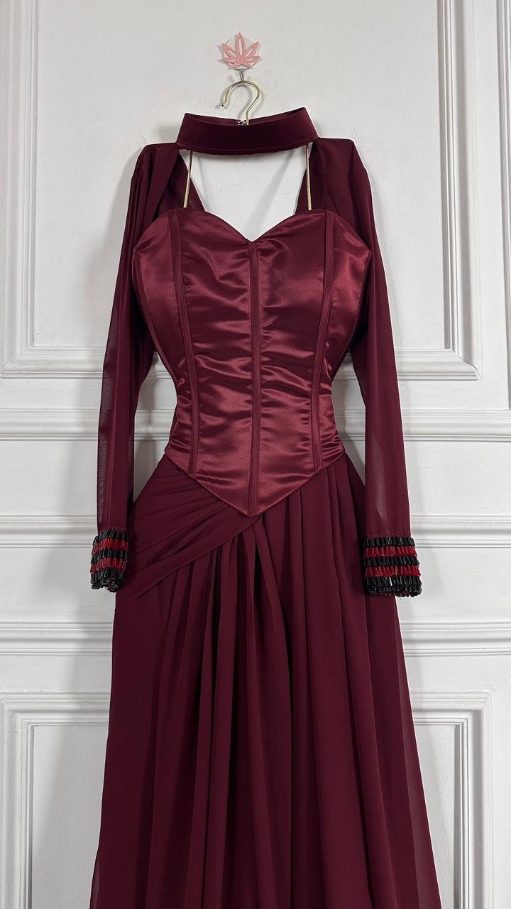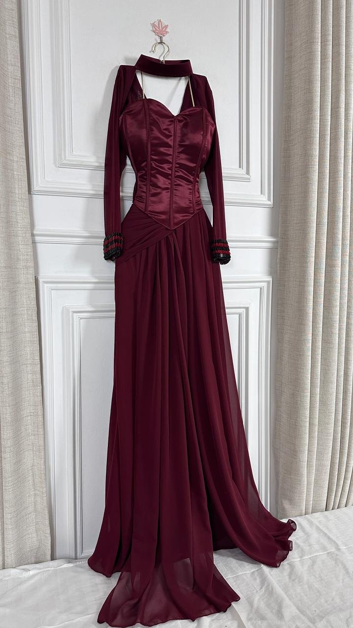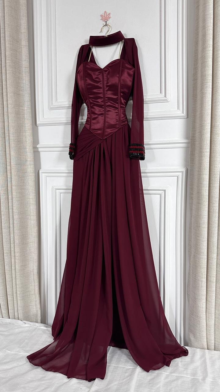 هذا الفستان الطويل المصمم بعناية باللون الأحمر الخمري الغامق الغني (البورغوندي) هو الخيار الأمثل لأي حدث رسمي، من حفلات الزفاف الراقية إلى حفلات العشاء الفاخرة، حيث يضمن لكِ حضوراً لا يُنسى.