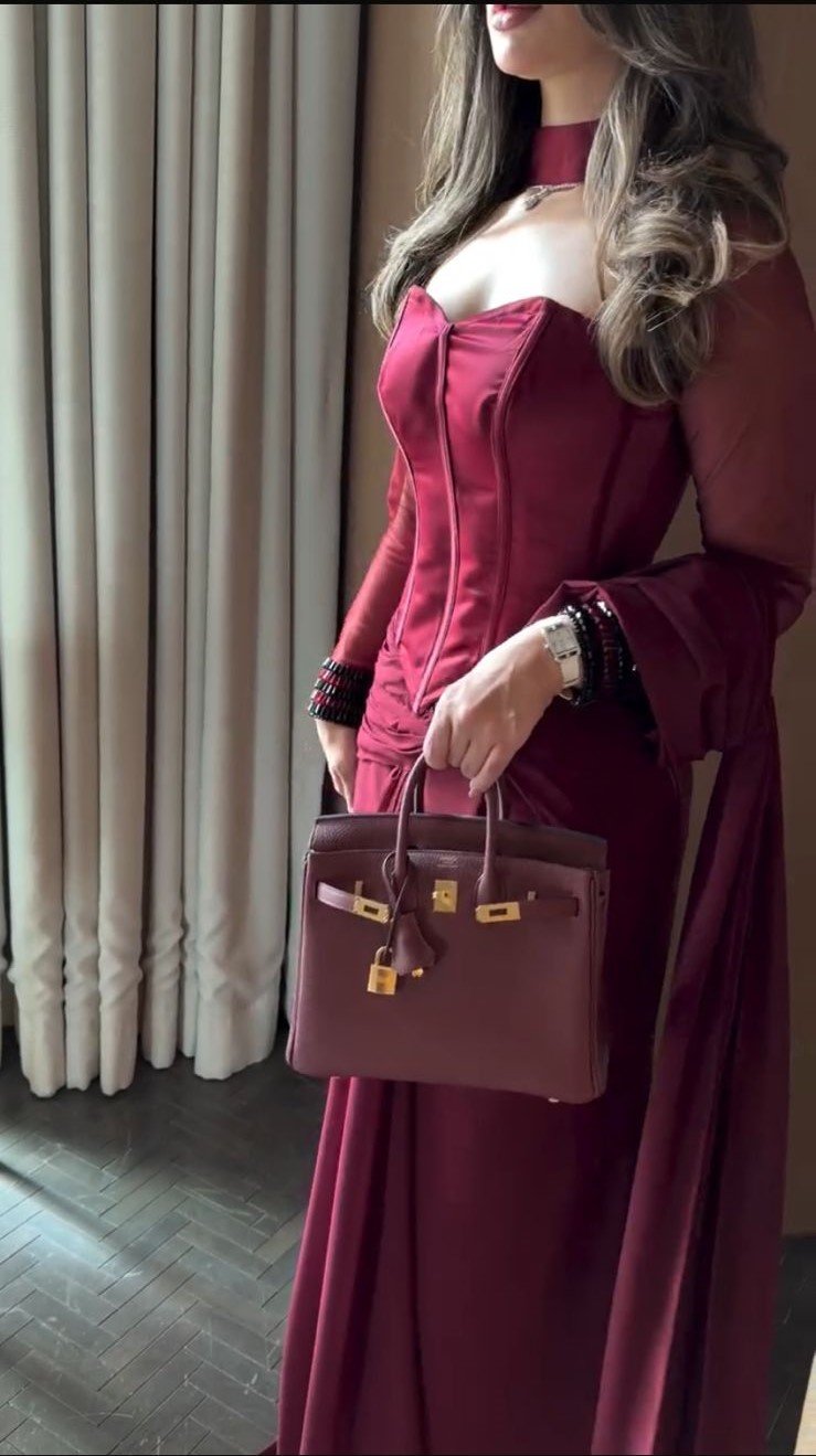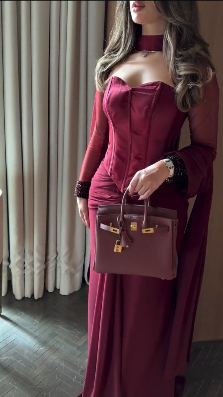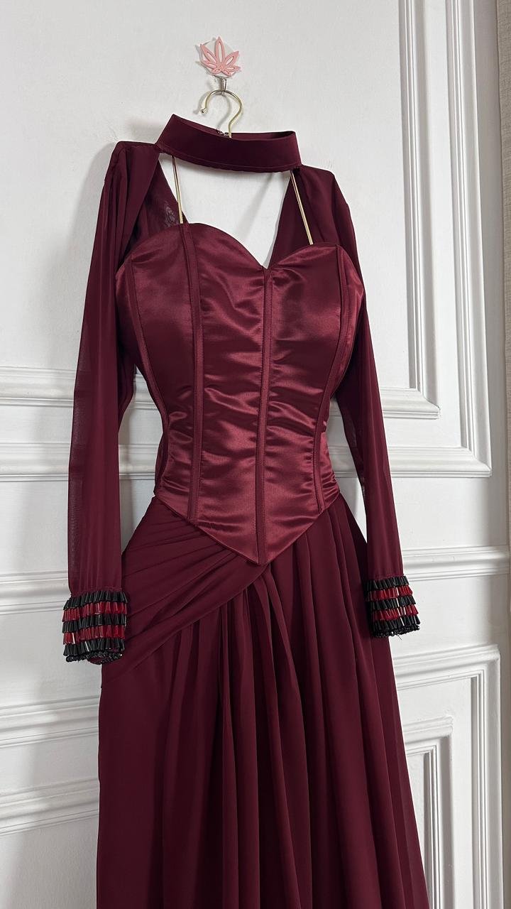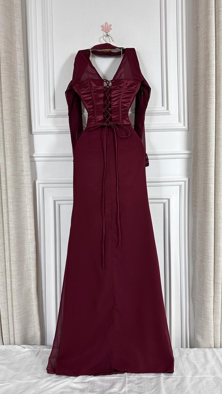 هذا الفستان الطويل المصمم بعناية باللون الأحمر الخمري الغامق الغني (البورغوندي) هو الخيار الأمثل لأي حدث رسمي، من حفلات الزفاف الراقية إلى حفلات العشاء الفاخرة، حيث يضمن لكِ حضوراً لا يُنسى.