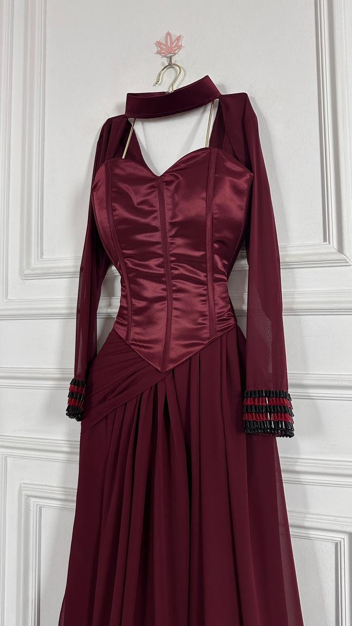 ارتقي بمظهركِ المسائي إلى مستوى جديد من الأناقة والدراما مع هذا الفستان الساحر المصمم بعناية، قطعة فنية تجمع بين هيكلية الكورسيه الكلاسيكية ونعومة قماش الجورجيت الانسيابي.