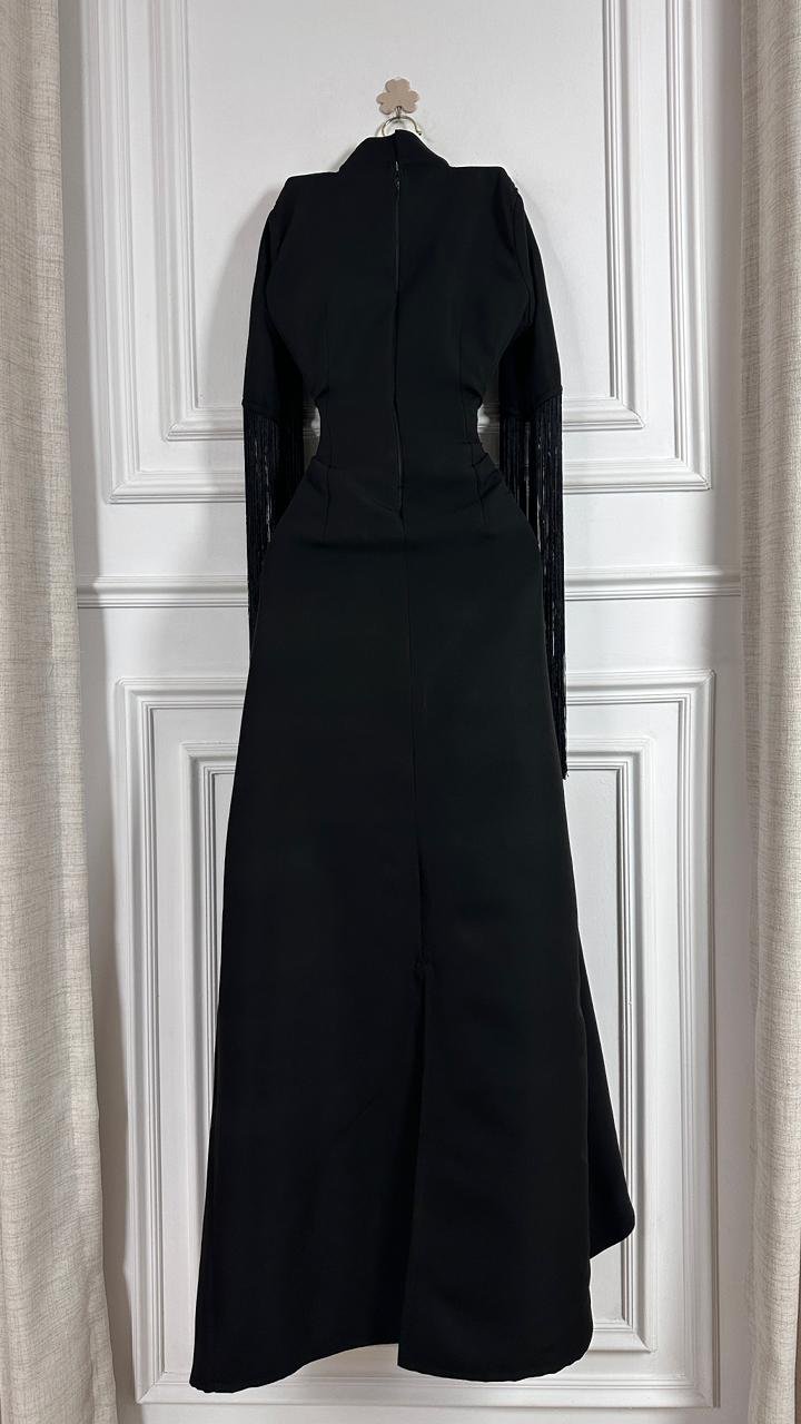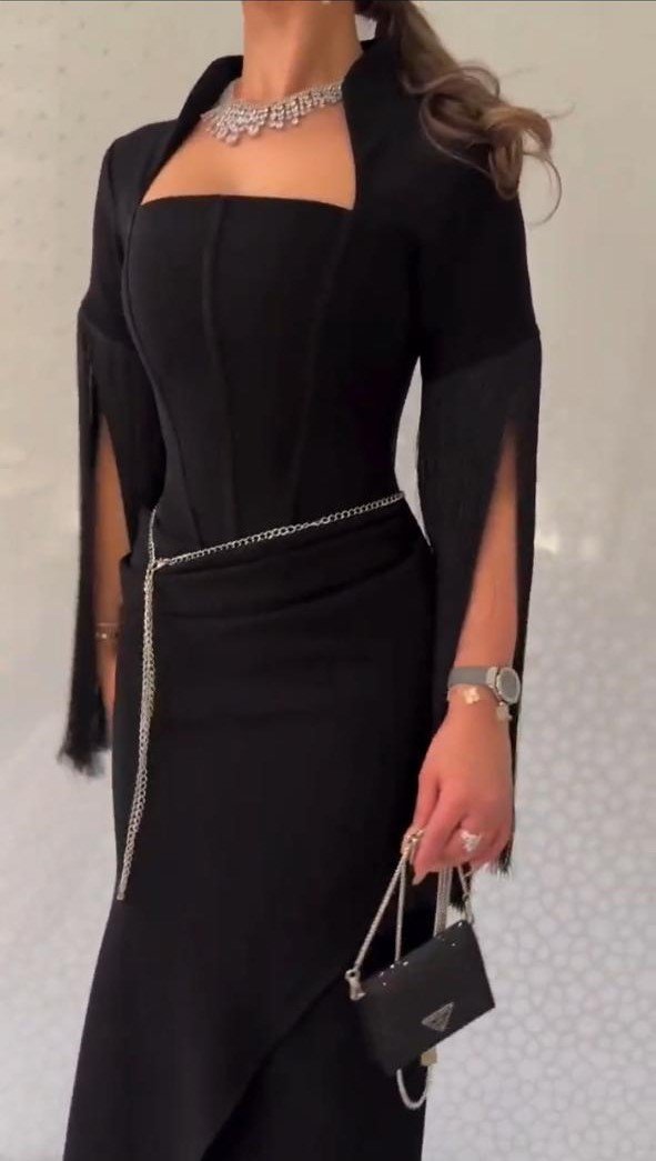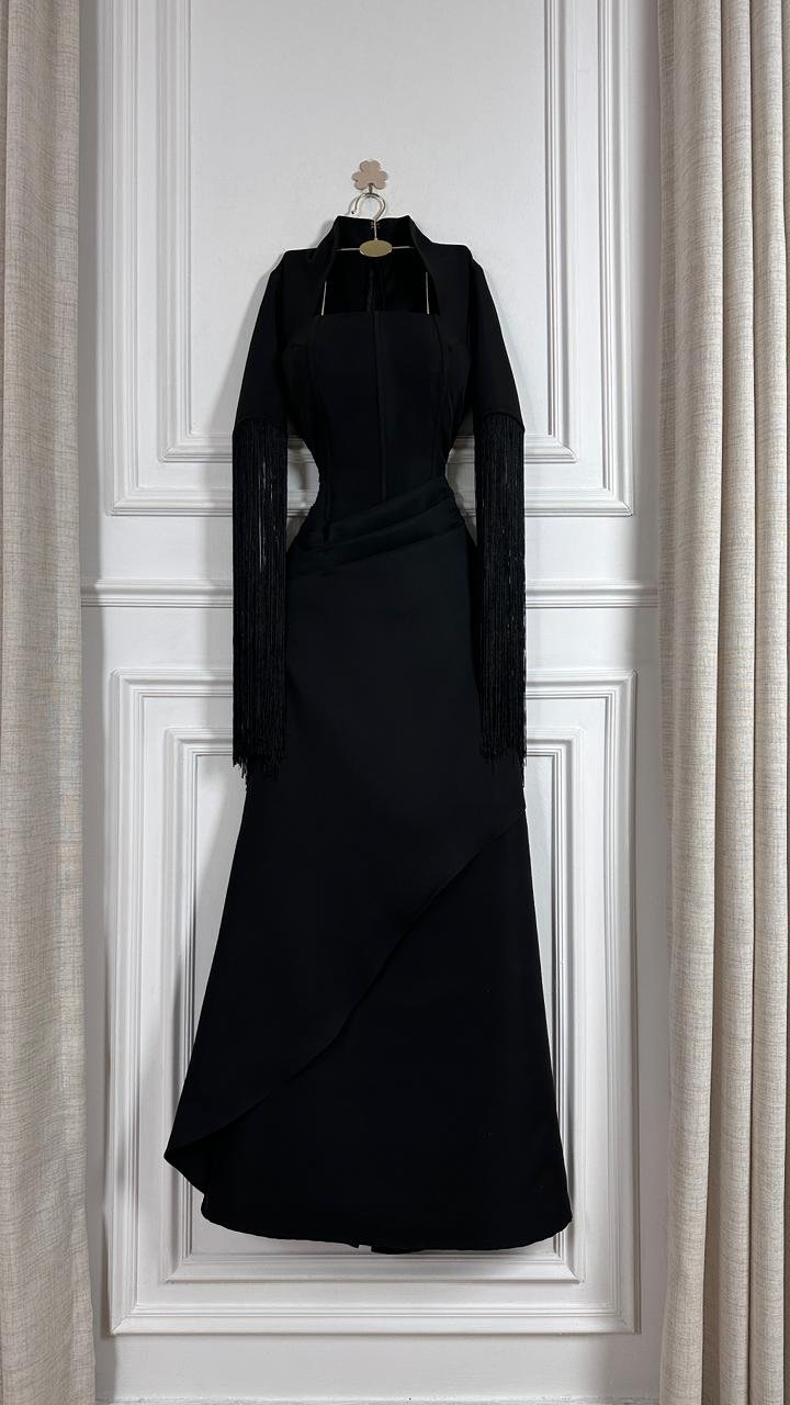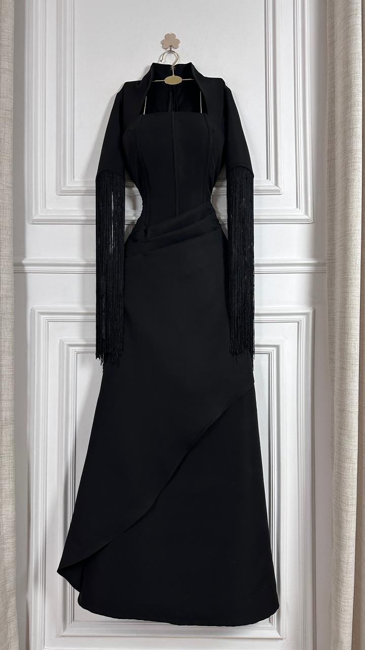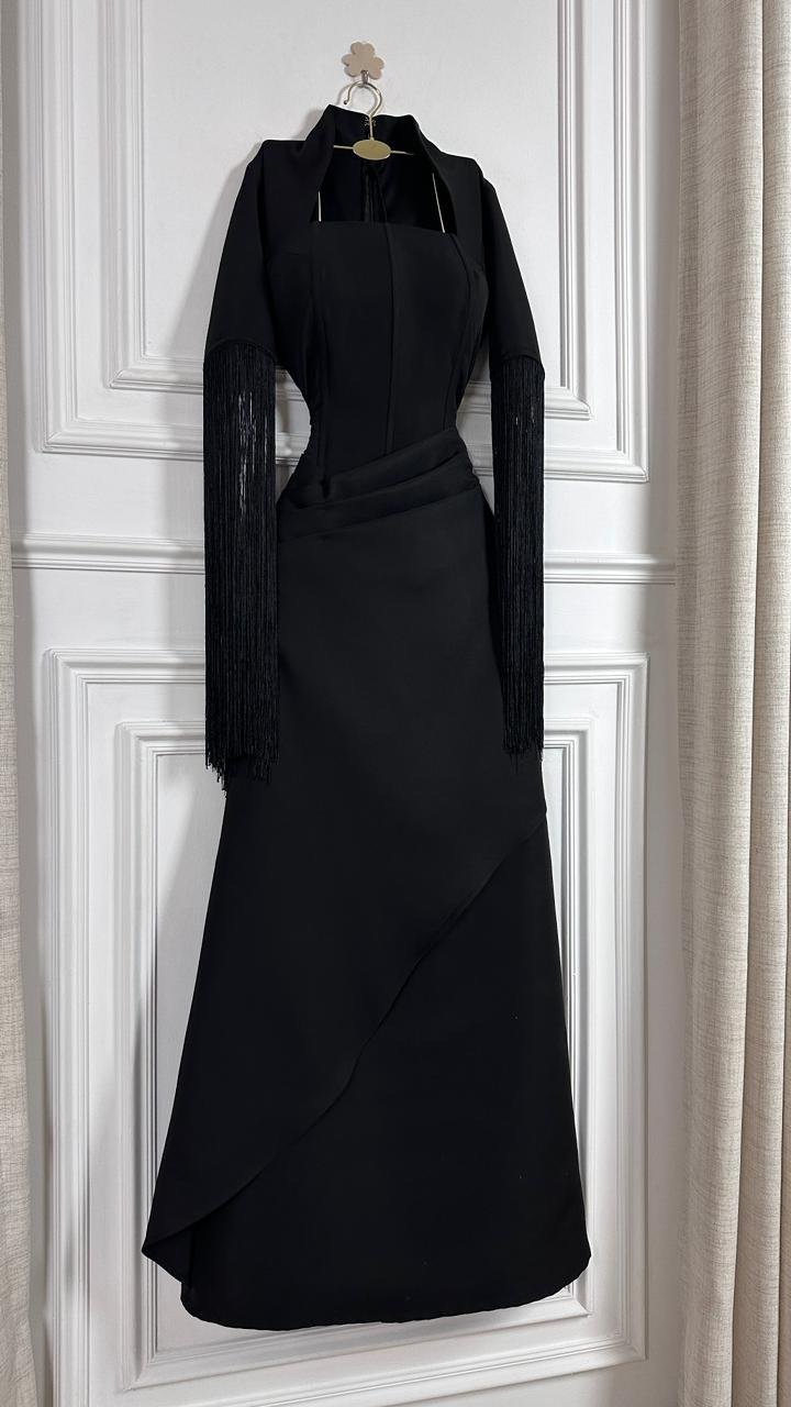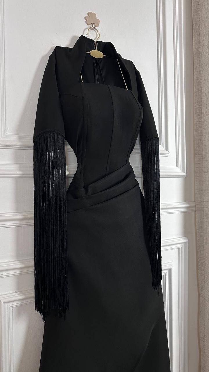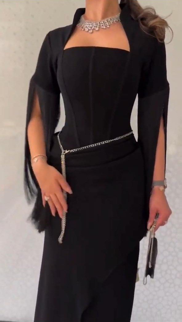 فستان سهرة أسود فاخر مصمم بأناقة عصرية من خامة الباربي الراقية التي تمنحه هيكلاً متماسكاً وملمساً ناعماً. يتميز الفستان بتصميم صدرية مكشوفة محددة بخصر ضيق، مع قطعة علوية كيب قصيرة متصلة بأكمام طويلة تنسدل منها شرابات الهدب الكثيفة والطويلة التي تضفي حركة ديناميكية وساحرة. تأتي التنورة الطويلة بقصة ضيقة “ميدي” ودرابيه ملتف يمنحه طيات أنيقة، مما يجعله خياراً مثالياً للسهرات والمناسبات التي تتطلب إطلالة جذابة ومتميزة.