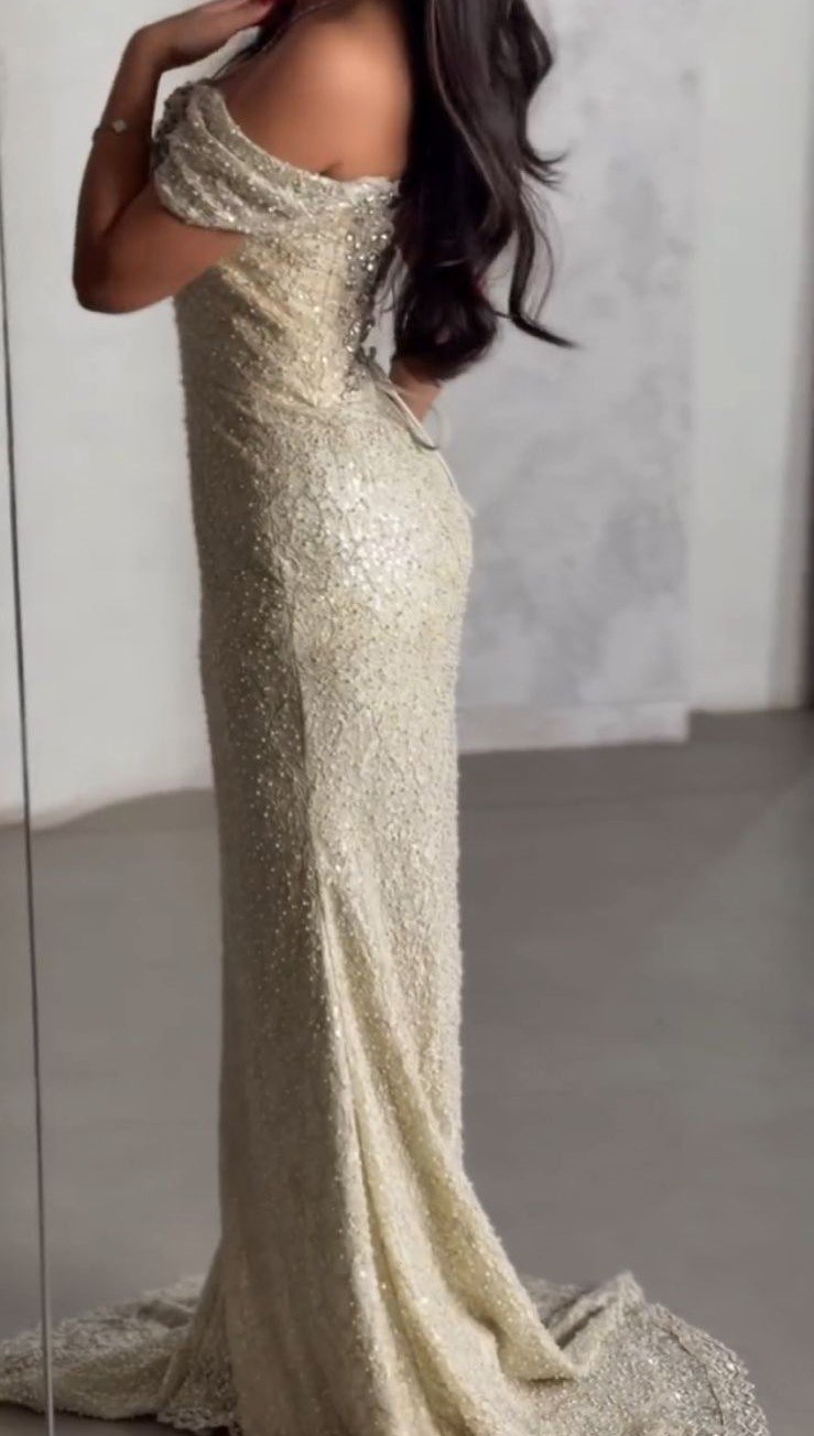 خامة الدانتيل الذهبي الفاخر: الفستان مغطى بالكامل بدانتيل فرنسي عالي الجودة بلون ذهبي شامبين راقٍ، مما يمنحه عمقاً وفخامة استثنائية.