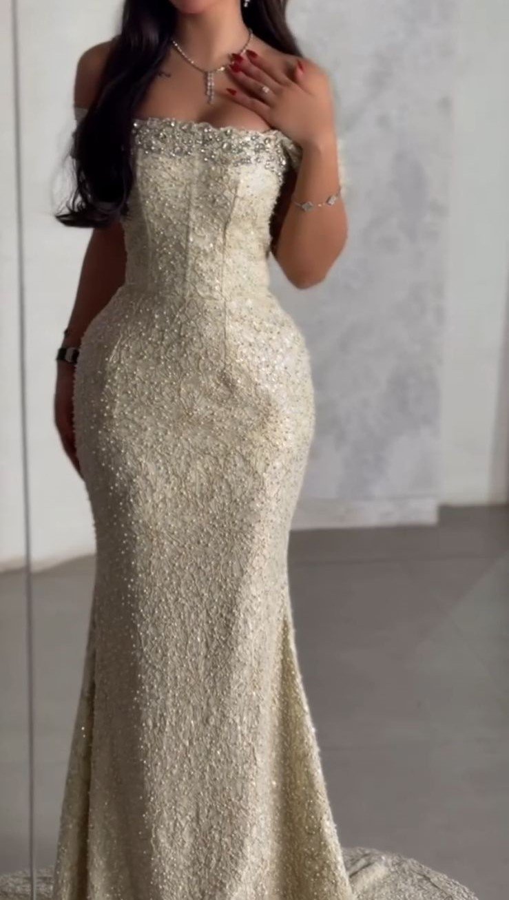 تطريز يدوي مكثف (اللول والخرز): يزدان جسم الفستان بالكامل بـ تطريز يدوي دقيق من حبيبات اللؤلؤ (اللول) الكلاسيكية وخرز كريستالي لامع، مما يخلق بريقاً هادئاً وساحراً يتبع انحناءات الجسم.