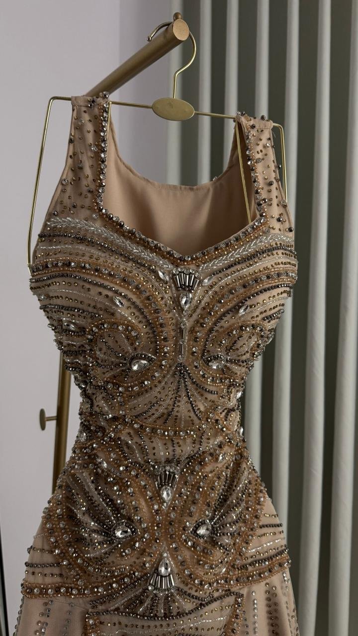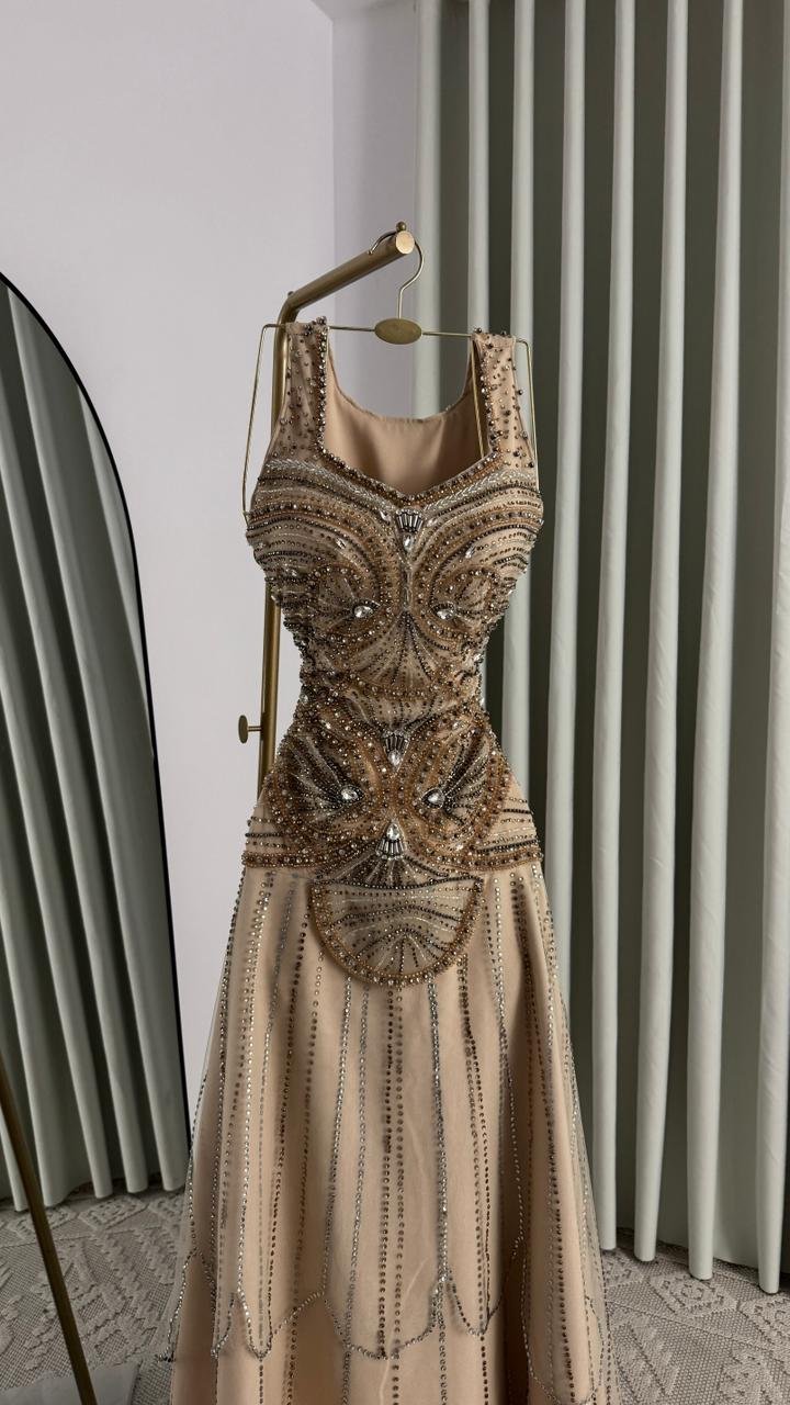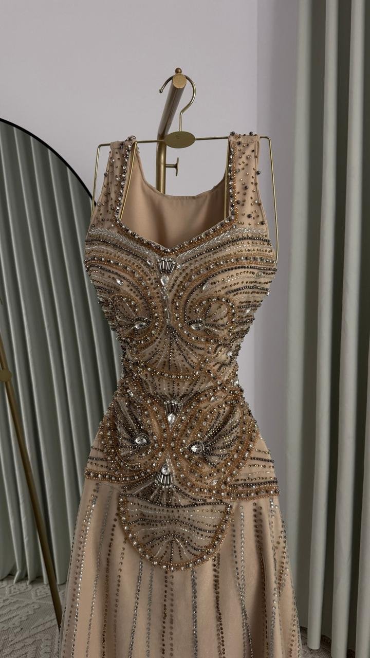 تطريز يدوي فاخر: الفستان مشغول بالكامل يدوياً بأنماط هندسية وزخارف فنية غنية، حيث تتناغم حبيبات الخرز مع فصوص الزركون الأصلية لتمنحكِ بريقاً ماسياً يخطف الأنظار مع كل حركة.