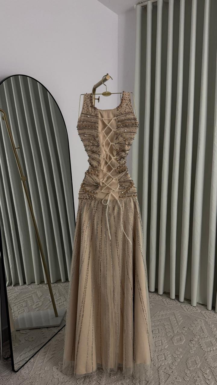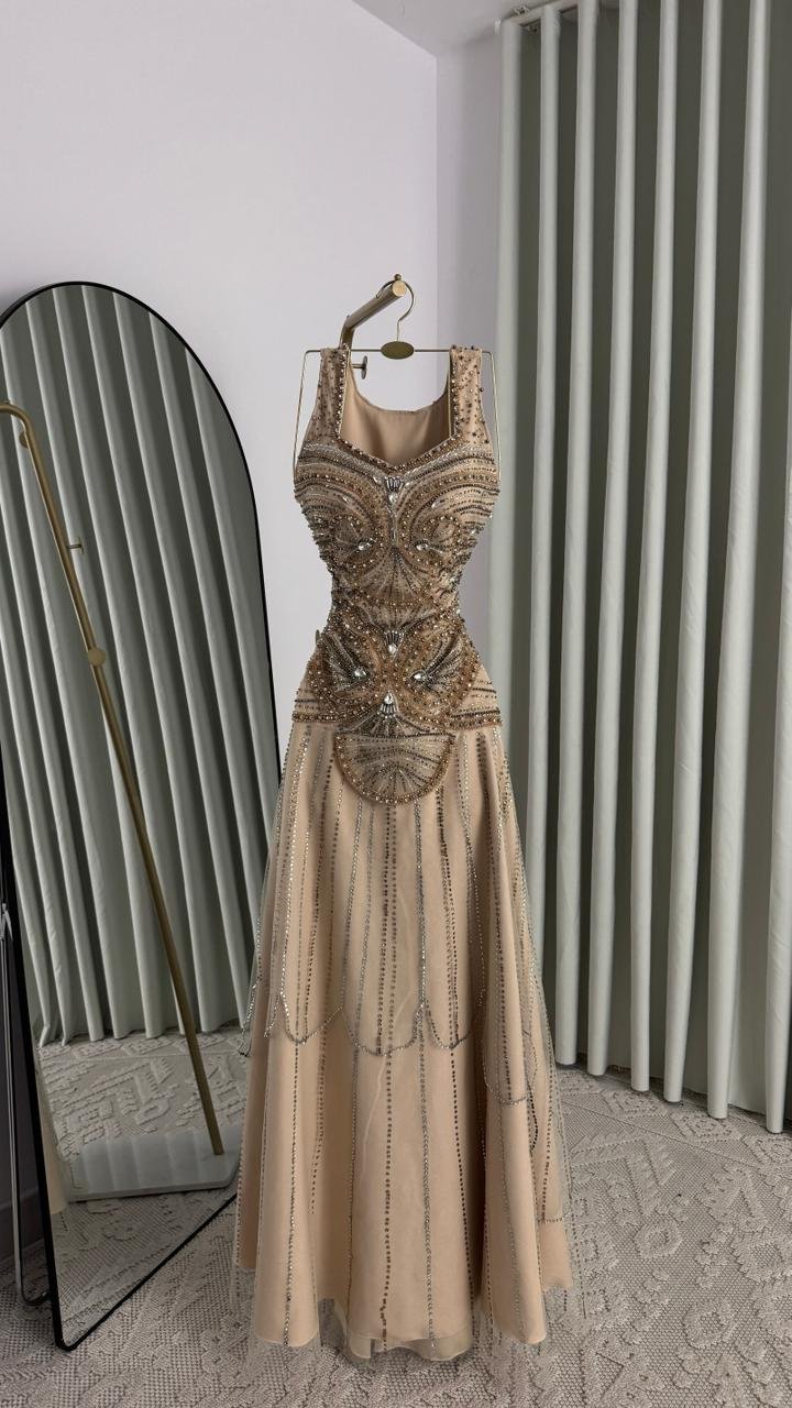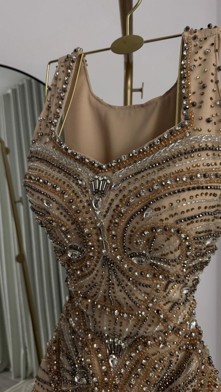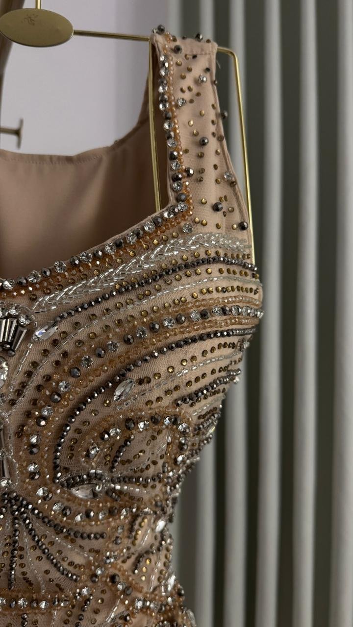 تطريز يدوي فاخر: الفستان مشغول بالكامل يدوياً بأنماط هندسية وزخارف فنية غنية، حيث تتناغم حبيبات الخرز مع فصوص الزركون الأصلية لتمنحكِ بريقاً ماسياً يخطف الأنظار مع كل حركة.
